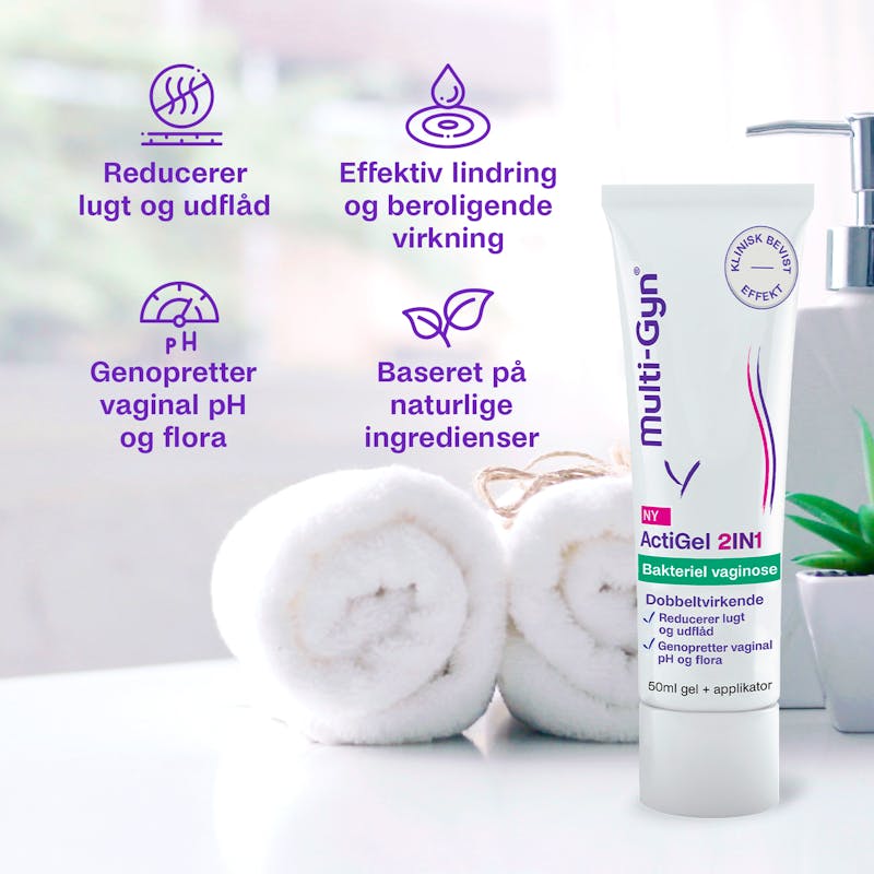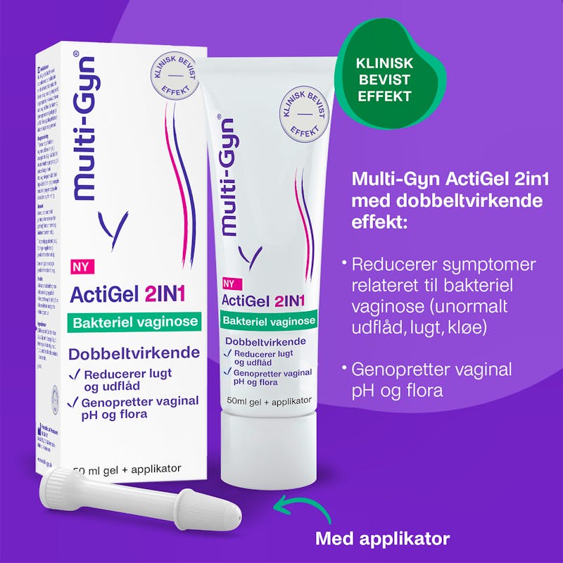 Multi-Gyn ActiGel 2in1 er til kvinder, der lider af de ubehagelige symptomer, der er relateret til bakteriel vaginose (BV). Multi-Gyn ActiGel 2in1 er yderst effektiv til behandling af BV og dets beslægtede gener som tyndt gråligt udflåd, fiskeagtig lugt, kløe, irritationer, følsomhed, rødme og ømhed. Multi-Gyn ActiGel 2in1 har en direkte beroligende virkning. Produktet indeholder det patenterede 2QR-complex, der blokerer for skadelige bakterier på en sikker, naturlig måde og optimerer vaginalfloraen. Multi-Gyn ActiGel 2in1 har ingen duft og er fri for hormoner og ingredienser af animalsk oprindelse.