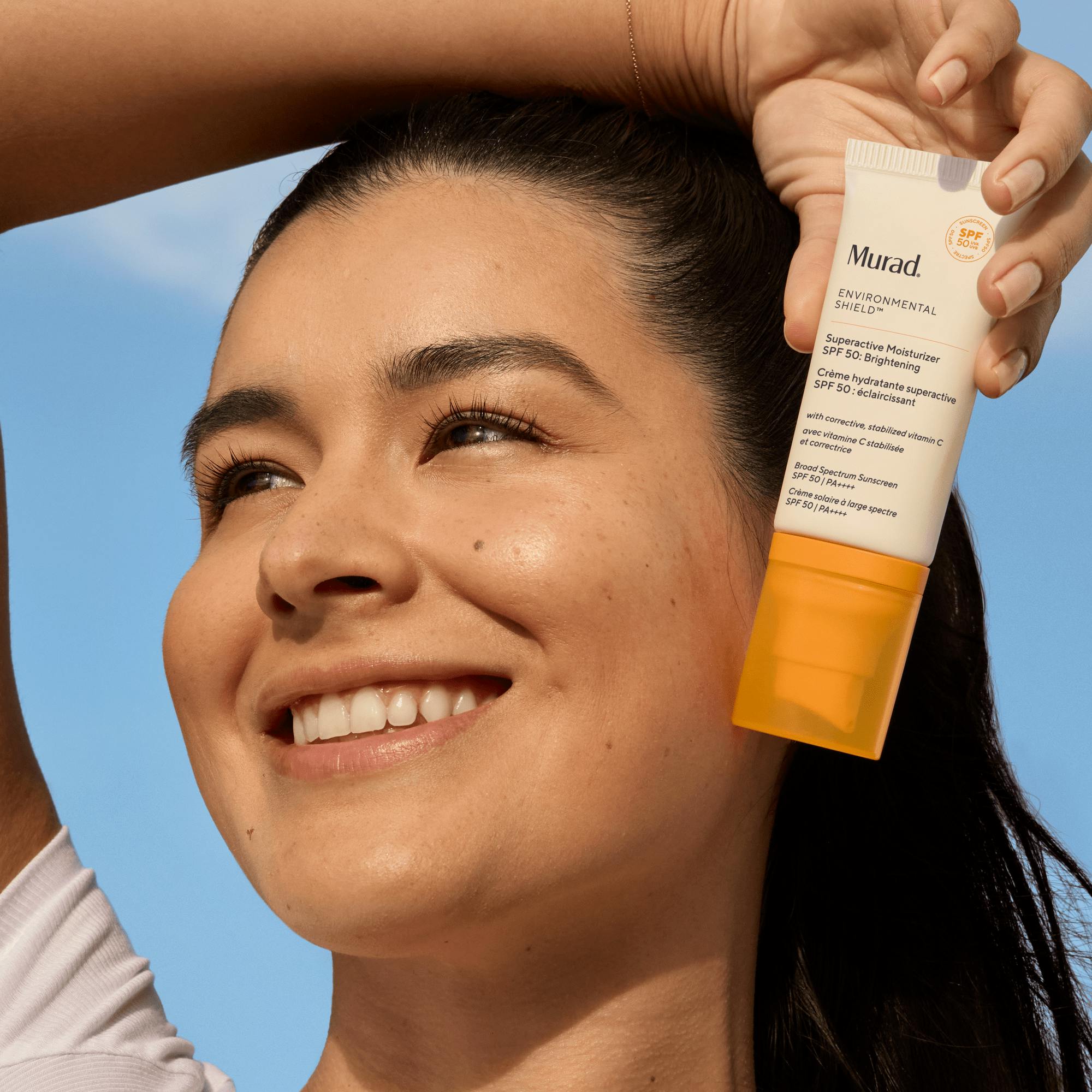 Murads Superactive SPF50 Moisturizer Brightening er et effektivt hudplejeprodukt, der er skabt til at beskytte og fremhæve din huds naturlige glød.