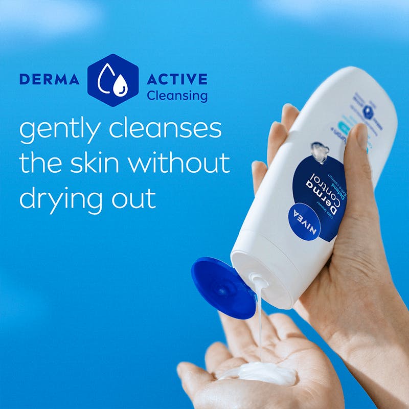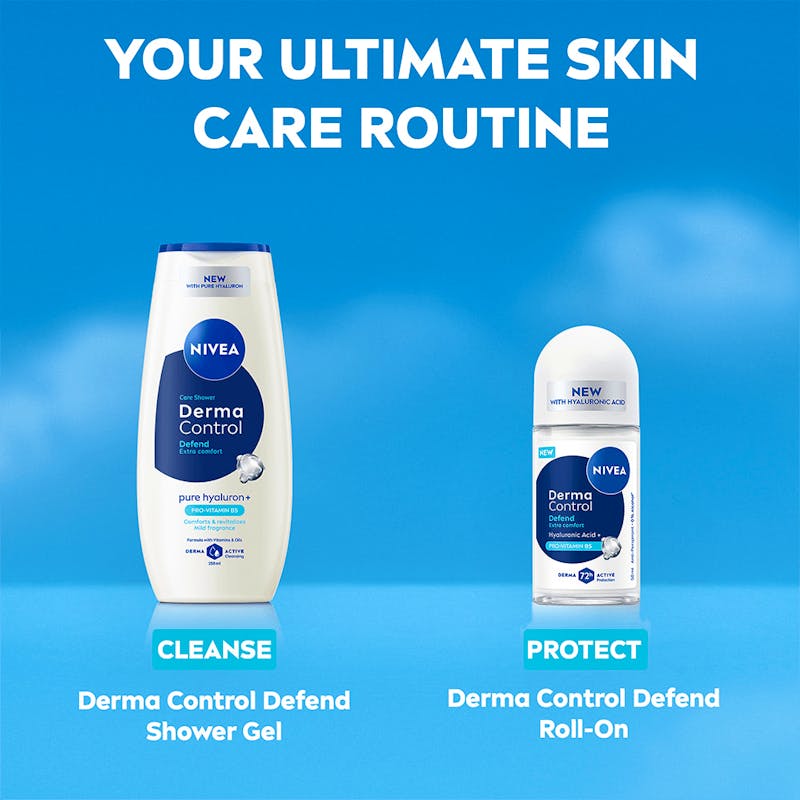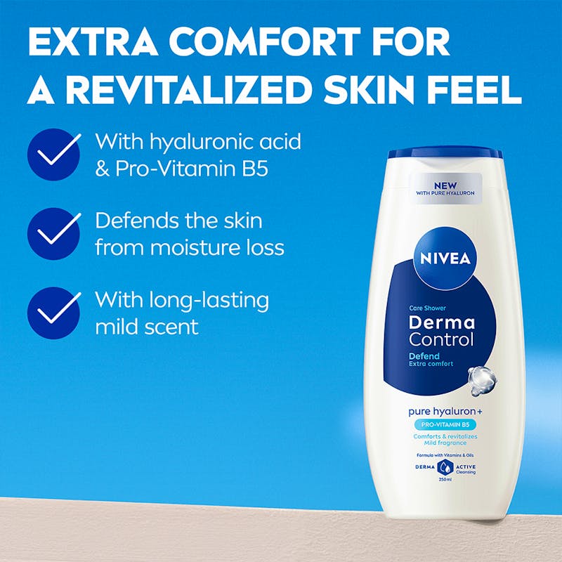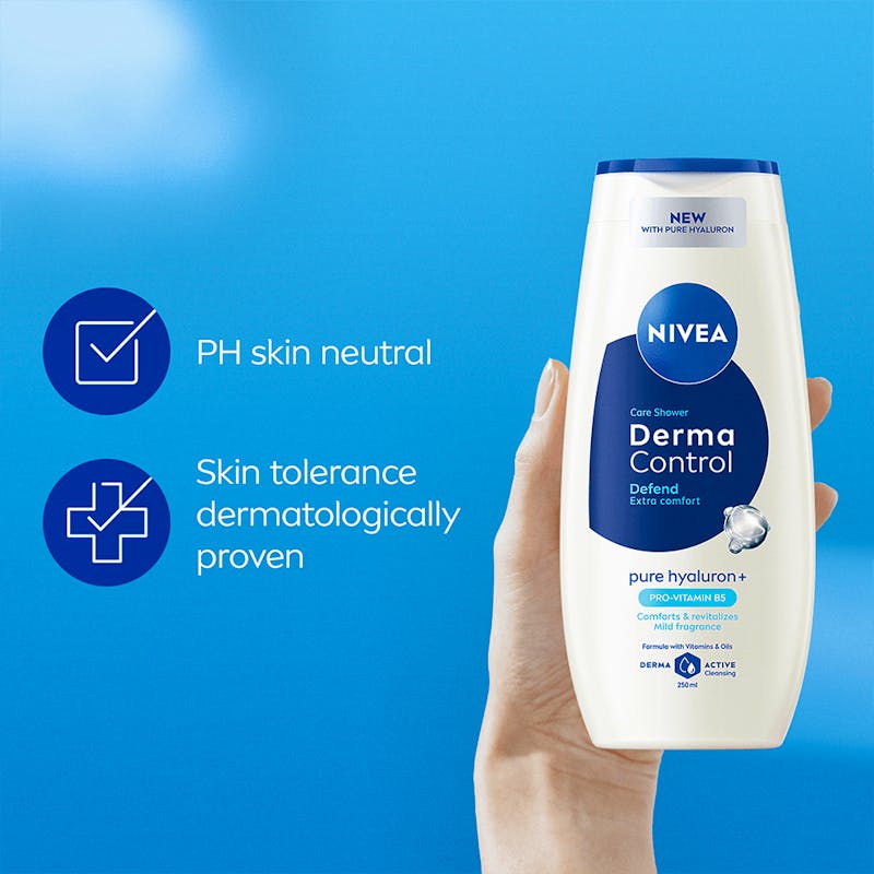 NIVEA Derma Control Defend Shower med ren hyaluron og Pro-Vitamin B5 revitaliserer din hud og giver ekstra komfort.