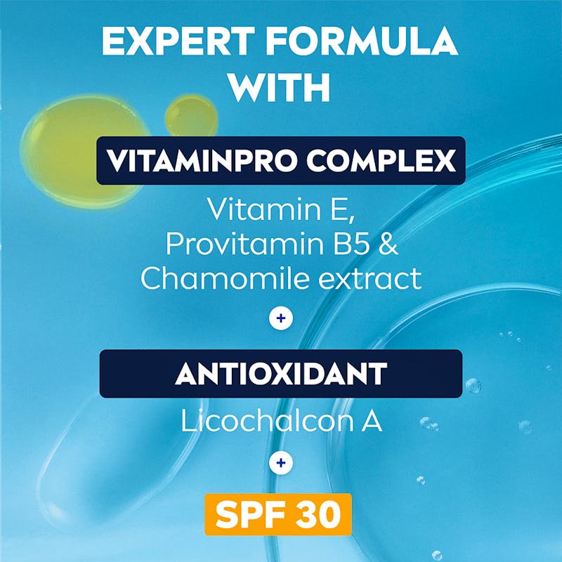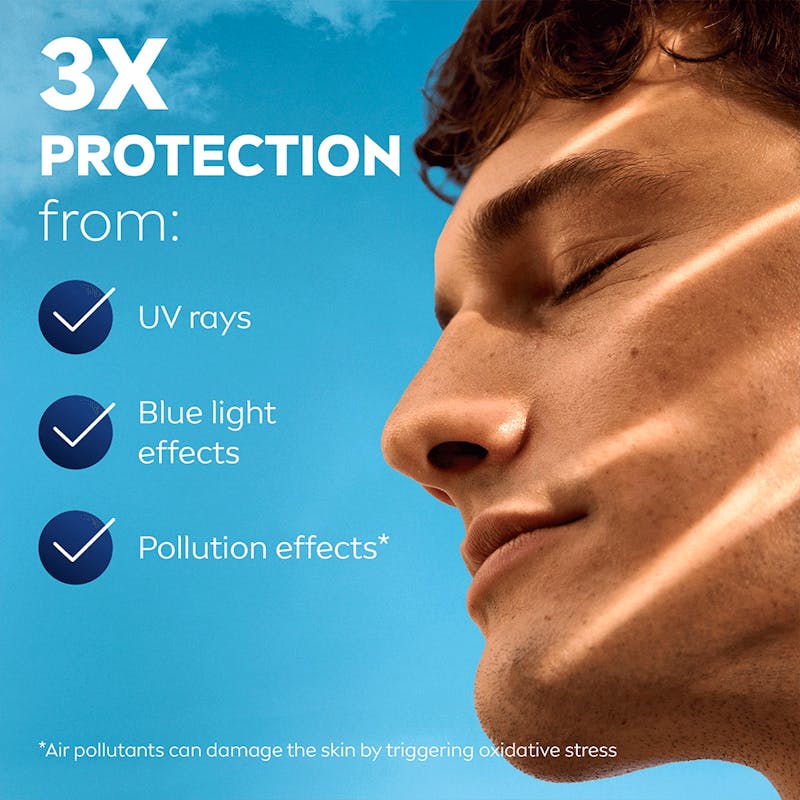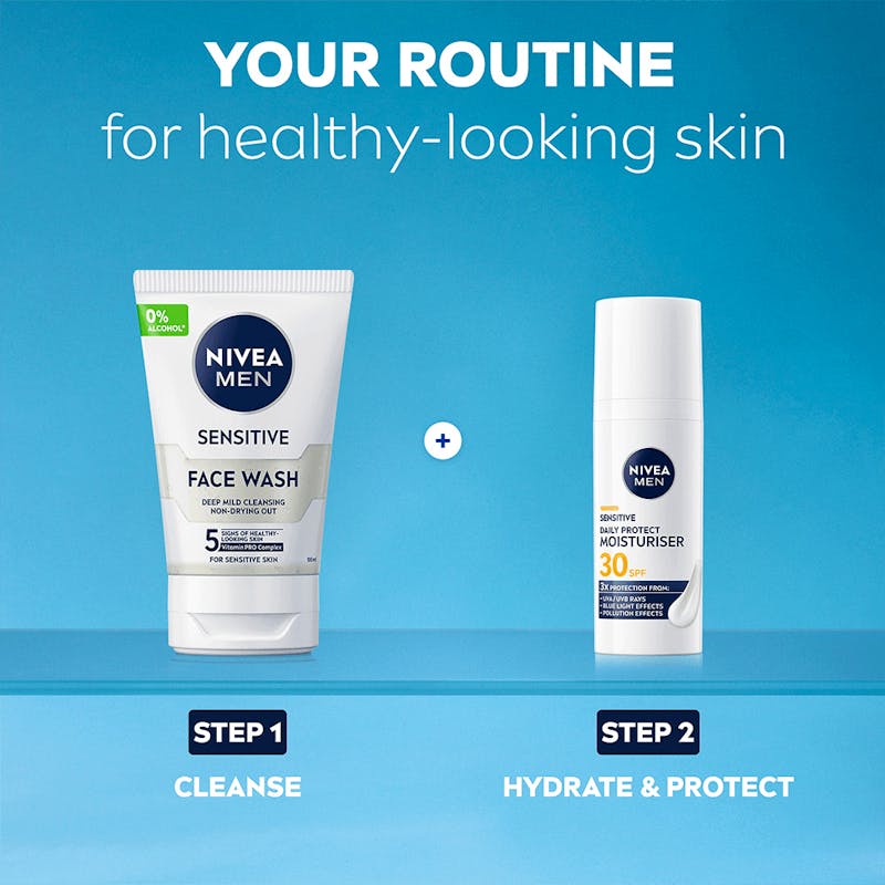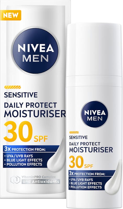 NIVEA MEN Sensitive Daily Protect Moisturiser beskytter følsom hud med SPF30, VitaminPRO Complex og antioxidanter. Den er let, ikke-fedtende og alkoholfri* og giver 3 gange beskyttelse mod UVA/UVB-stråler, blåt lys og forurening for en sund og fugtet hud hele dagen.
