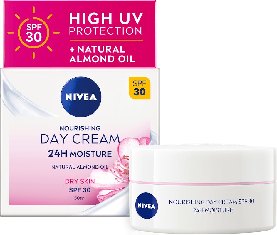 NIVEA Nourishing Day Cream Moisturiser SPF 30 er udviklet til at give intens næring og glathed til tør hud. Formlen med NIVEA Moisture Care Complex og naturlig mandelolie fugter huden intensivt i op til 24 timer og hjælper dermed med at balancere hudens egen fugtighedsbalance. Cremen nærer og udglatter huden i dybden, samtidig med at den beskytter mod ydre påvirkninger. Hudvenligheden af denne dagcreme er dermatologisk testet. Cremen med SPF 30 giver beskyttelse mod sollysrelaterede påvirkninger.
