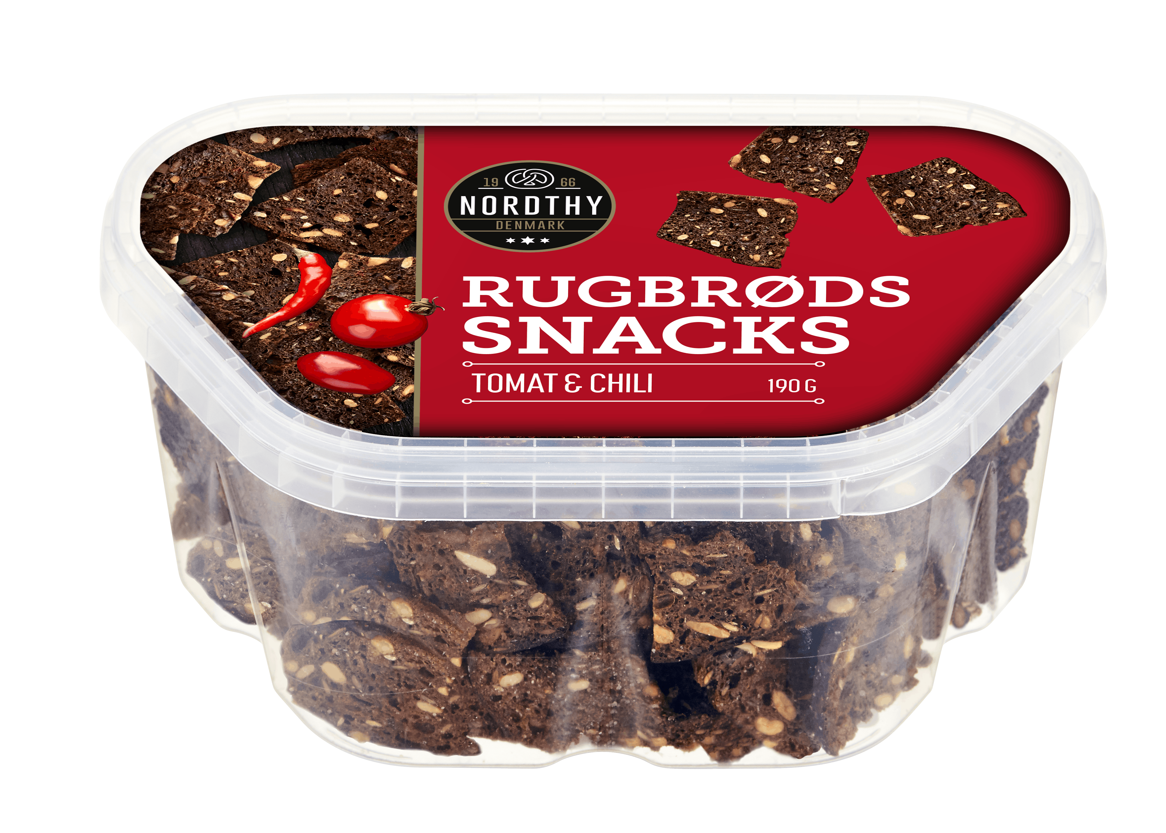 Rugbrødssnacks Tomat & Chili fra Nordthy er en lækker og smagfuld snack, der vil tilfredsstille dine smagsløg.