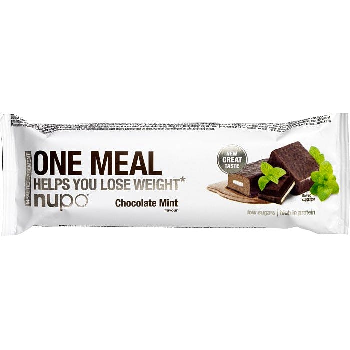 Nupo One Meal Bar med smag af Chocolate Mint er en måltidserstatningsbar. Den handy One Meal Bar fra Nupo kan erstatte et måltid eller udgøre et mellemmåltid på farten. Baren har et højt proteinindhold og indeholder både vitaminer og mineraler. Det samlede kalorieindhold på hele baren er kun 214 kcal og i samspil med Nupo's andre vægttabsprodukter kan Nupo One Meal Bar Chocolate Mint indgå i en slankekur uden at sprænge kaloriebudgettet. Nupo One Meal Bar Chocolate Mint indeholder 60 gram.
