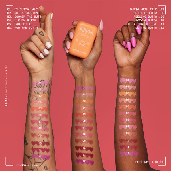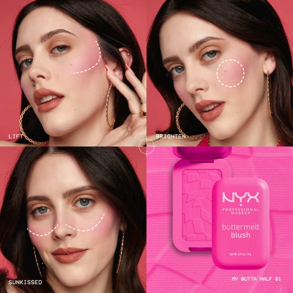 Buttermelt Blush fra NYX Professional Makeup er fuld af lækre pigmenter som er nemme at tone ud og som holder længe. Den cremede formel er fuld af smukke pigmenter som er nemme at tone ud. Beriget med mangosmør, mandelsmør og sheasmør - så går alt som smurt! Anvend sammen med Buttermelt Blush Brush for en perfekt påføring.