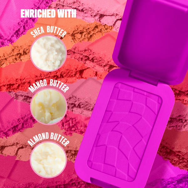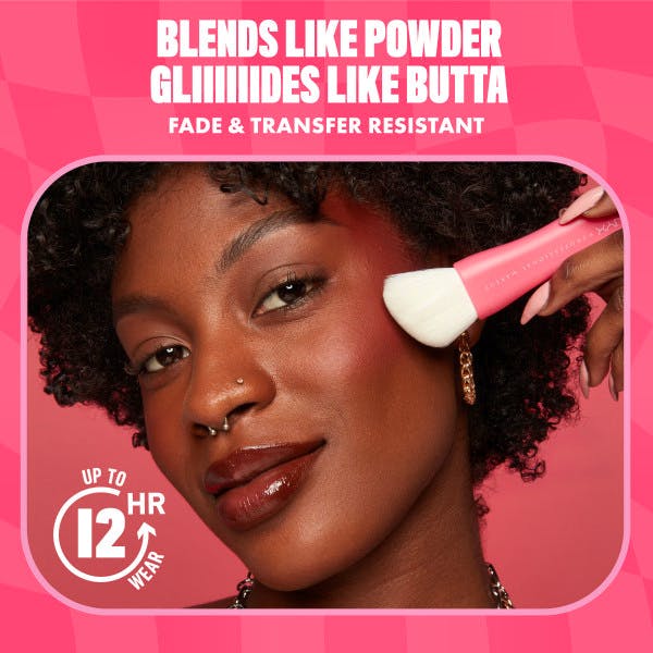 Anvendelse: Blush hack: Dup formlen let på panden. Anvend derefter børsten til at påføre på dine kinders øverste punkter, op over tindingerne og eventuelt også hen over næsen for varmt look. Afslut med Buttermelt bronzer for et solkysset look.