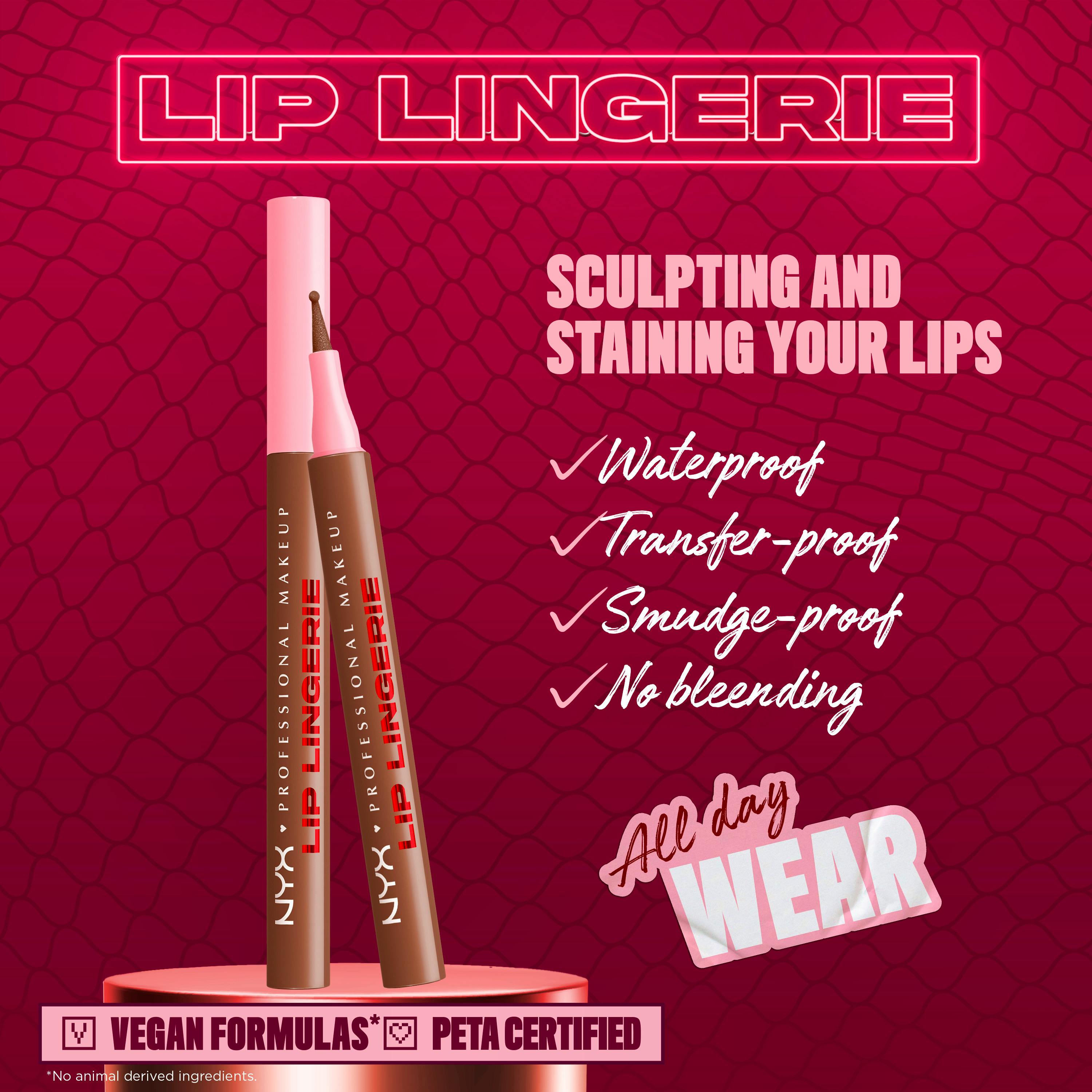 Farve! Form! Facon! NYX Professional Makeup Lip Lingerie Liner Stain er dit uundværlige værktøj til at forme og farve dine læber. Denne innovative flydende liner stain holder hele dagen, smitter ikke af, tværer ikke ud og er vandfast, så dit læbelook forbliver intet mindre end fejlfrit. Den er designet med en alsidig filt-kuglespids og kommer effektivt rundt på hver en kurve, så du kan lave linjer med præcision, konturere for en push-up-effekt, eller udfylde hele din læbe med den behagelige og lette farve. Ton skarpe linjer ud for smukke skulpturerede læber og en farve der ikke bløder. Formlen smelter på dine læber, definerer dem og holder længe uden at du skal trække formlen af.