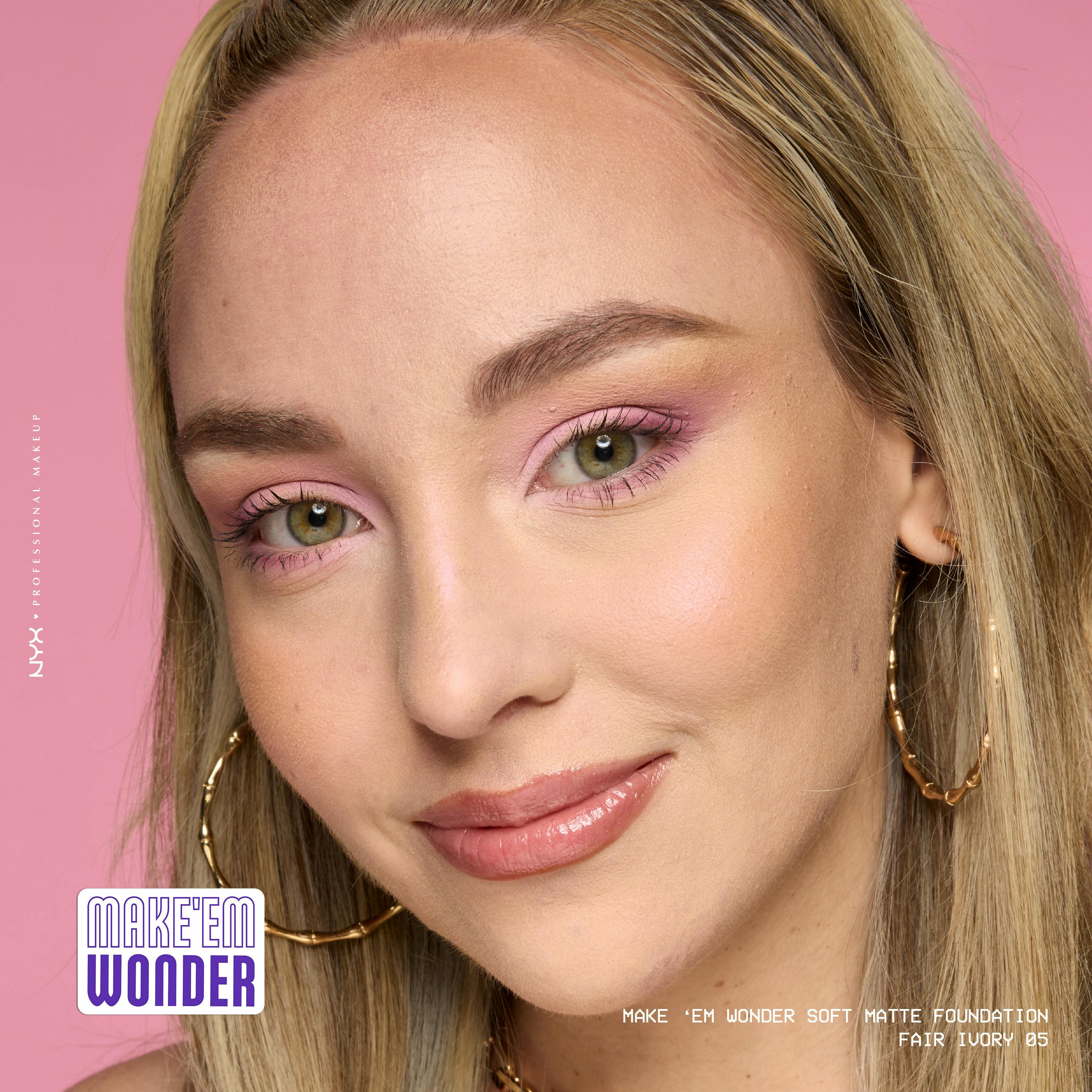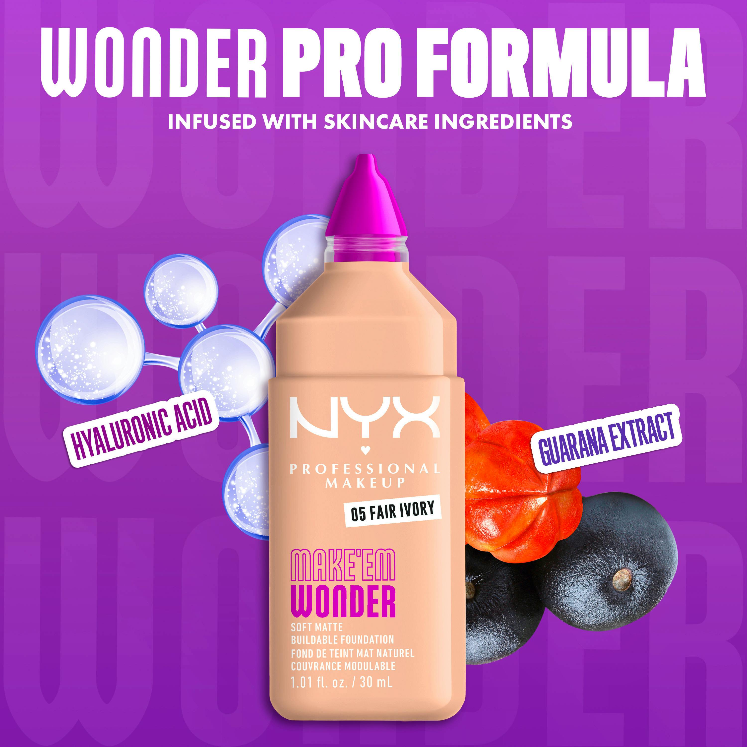 MAKE 'EM WONDER om det er foundation eller om det virkelig er din egen hud med denne bløde, matte og opbyggelige formel.NYX Professional Makeup Make'em Wonder foundation er beriget med hudplejeingredienser, dækker alt men føles stadig vægtløs på din hud.