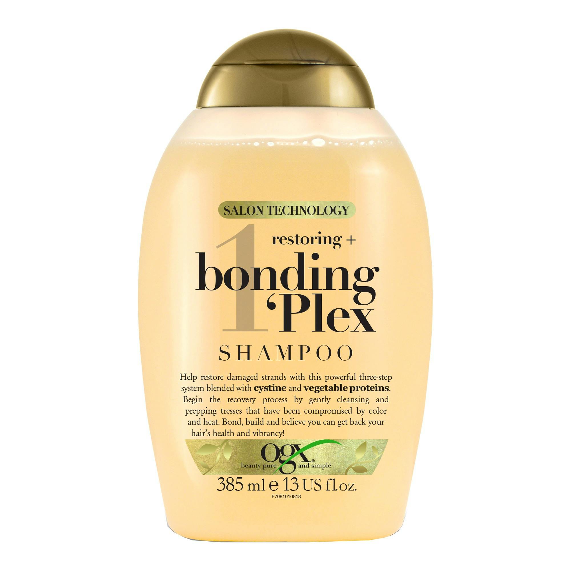 Med OGX Bonding Plex Shampoo kan du genopbygge dit stakkels, slidte hår. Denne shampoo renser dit hår effektivt samtidig med at den genopbygger slidte hårstrå. Takket være indholdet af cystine og vegetabilske proteiner kan OGX Bonding Plex Shampoo komme udsat hår til undsætning. Har dit hår været udsat for farvning eller kontinuerlig varmebehandling, så er denne shampoo et godt valg til dig. Med denne shampoo kan dit hår endelig genvinde sin sundhed og sin oprindelige glans. Shampooen medvirker også til at forebygge fremtidige skader på håret. Shampooen indgår som en 1. trin i en 3. trins plejerutine med andre produkter fra OGX, men kan også sagtens anvendes alene.
