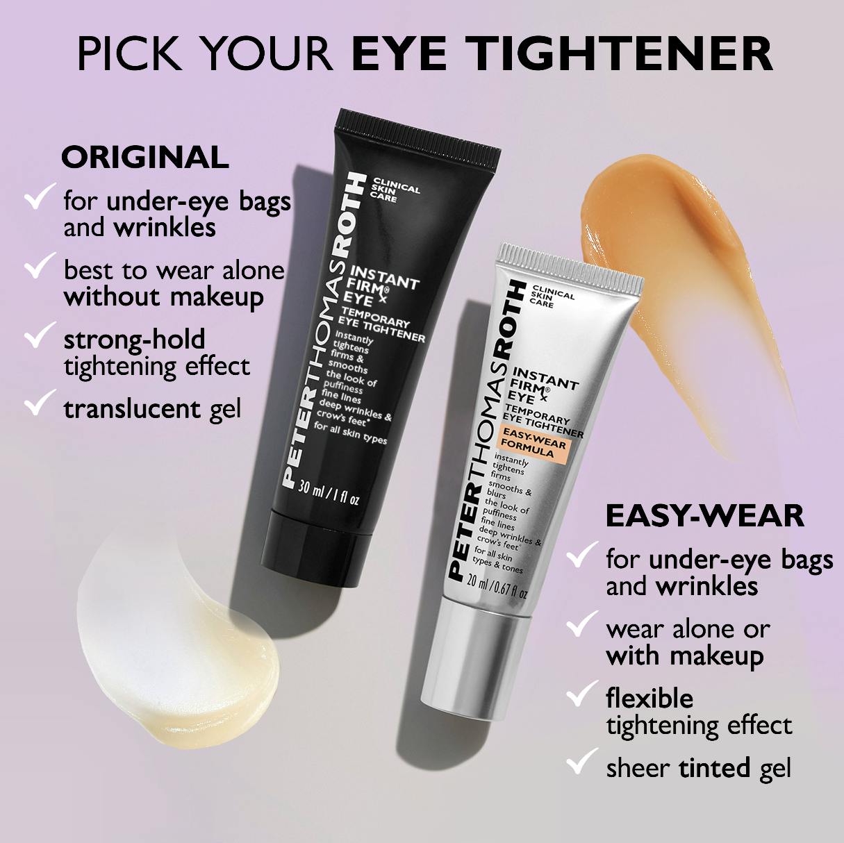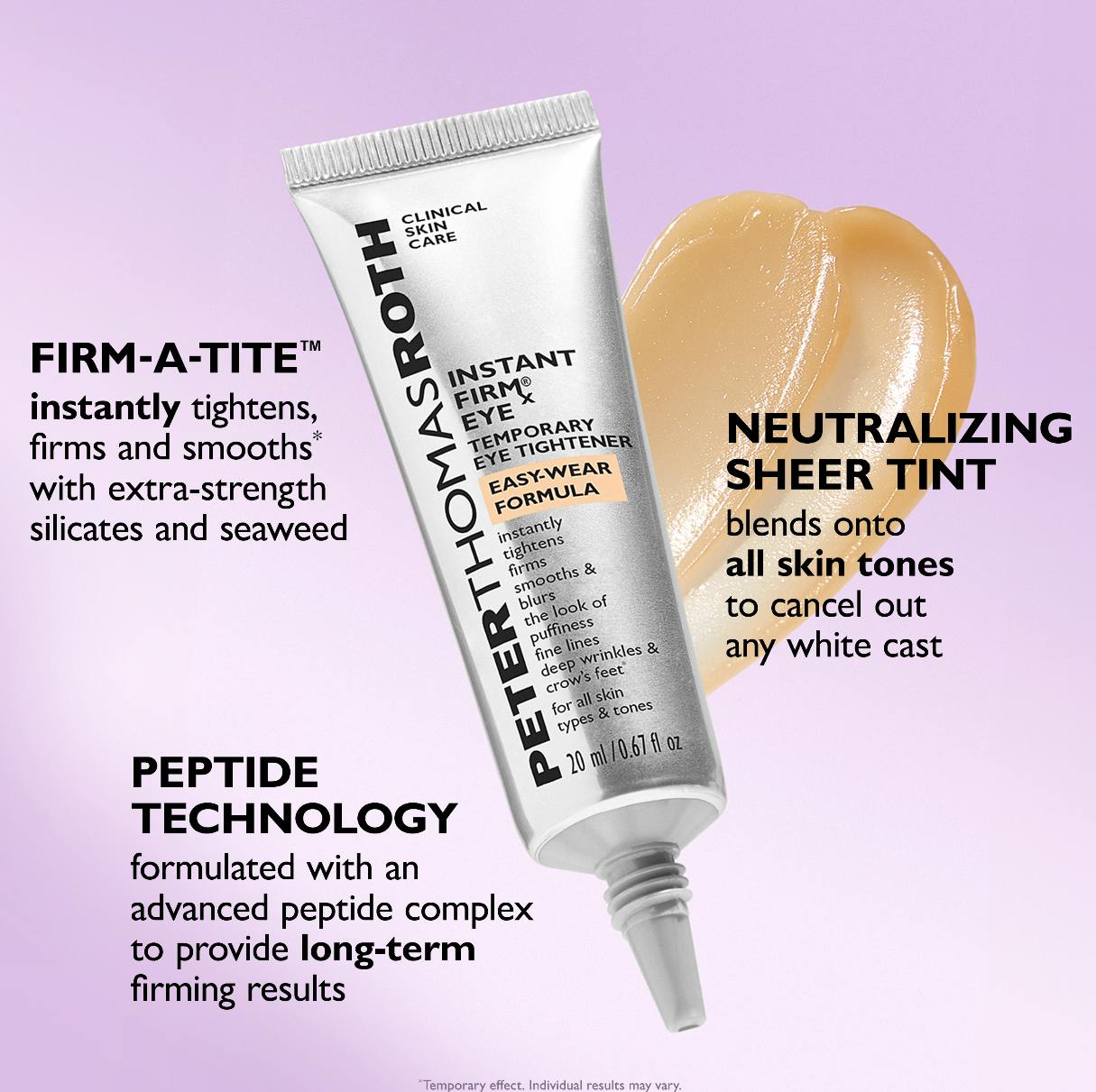 Peter Thomas Roth Instant FIRMx® Eye Temporary Eye Tightener Easy-Wear Formula giver en øjeblikkelig opstrammende effekt som midlertidigt reducerer poser under øjnene, fine linjer, dybe rynker og kragetæer – med en midlertidig effekt, der kan holde hele dagen*.