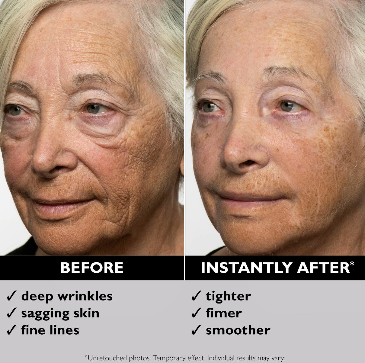 Peter Thomas Roth Instant FIRMx® Temporary Face Tightener giver en øjeblikkelig opstrammende effekt, der synligt reducerer fine linjer, dybe rynker og porer – med en midlertidig effekt, der kan holde hele dagen*. Den ekstra kraftfulde formel virker hurtigt på panderynker, kragetæer og nasolabiale linjer med Firm-A-Tite™, en effektiv blanding af opstrammende silikater og havalgeekstrakt, der hjælper med at udjævne og opstramme hudens udseende. Formlen er beriget med C- og E-vitamin samt provitamin B5, som nærer, fugter og giver antioxidantbeskyttelse, der bidrager til forbedret hudstruktur over tid. Huden fremstår synligt fastere, glattere og mere ungdommelig – blot få minutter efter påføring.
