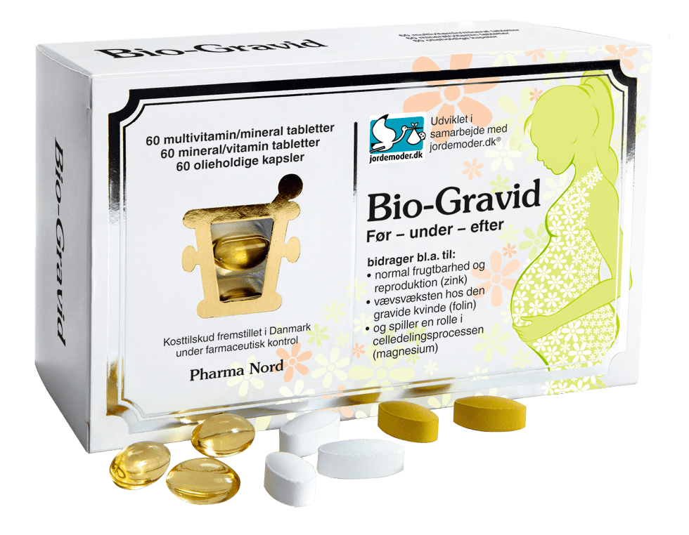 Pharma Nord Bio-Gravid er et kosttilskud til vordende mødre, gravide og ammende, der er udviklet i samarbejde med jordemoder.dk. Pakken indeholder de vitaminer, essentielle fedtsyrer og vitaminer som netop har stor betydning for din graviditet. Pharma Nord Bio-Gravid er fremstillet på virksomhedens egen fabrik. Kvalitet, sikkerhed og virkning er dokumenteret eftersom Pharma Nord Bio-Gravid er fremstillet på virksomhedens egen fabrik, efter samme retningslinjer som lægemidler. Den anbefalede daglige dosis er 2 x multivitamin/mineral-tabletter (gul), 2 x mineral/vitamin-tabletter (hvid) og 2 x olieholdige kapsler (blød gelatine-kapsel).
