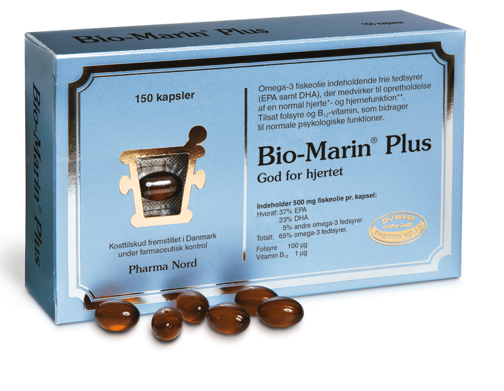 Bio-Marin Plus er et letoptagelige kosttilskud og faktisk også den eneste fiskeolie i Danmark, som indeholder frie fedtsyrer. Kosttilskuddet bidrager til vedligeholdelse af en normal hjerne- og hjerte funktion, stofskifte samt et normalt immunforsvar. Bio-Marin Plus er et særligt godt supplement til dem, der af forskellige årsager ikke spiser nok fisk i hverdagen. Den anbefalet daglig dosis er 1-4 kapsler dagligt for voksne samt børn på 11 år og derover, afhængigt af hvor meget fisk, der i øvrigt konsumeres. Tabletterne er synkevenlige.