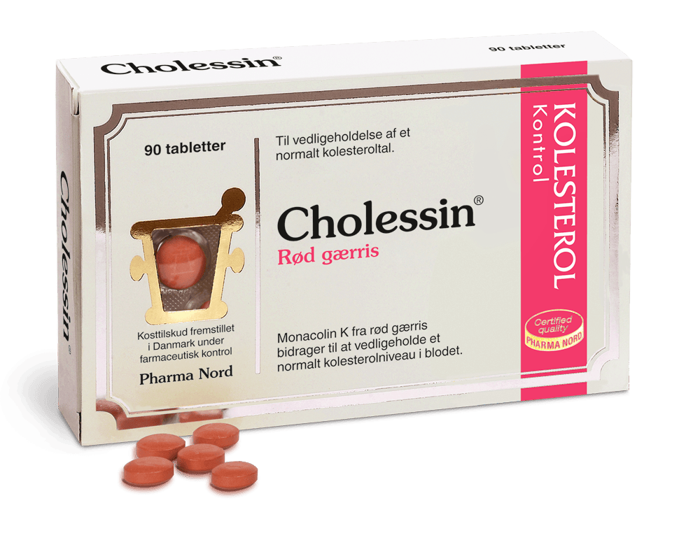 Pharma Nord Cholessin er et kosttilskud, som indeholder det aktive stof Monacolin K, der udvindes af rød gær-ris, som bidrager til et normalt kolesterolniveau i blodet. Rød gær-ris indeholder også forskellige umættede fedtsyrer og phytosteroler. For at opnå en virkning af kosttilskuddet er den anbefalede daglige dosis 10 mg Monacolin K svarer til 1 tablet dagligt i forbindelse med et måltid for voksne og børn over 11 år. Kosttilskud bør ikke erstatte en varieret kost og en sund livsstil.
