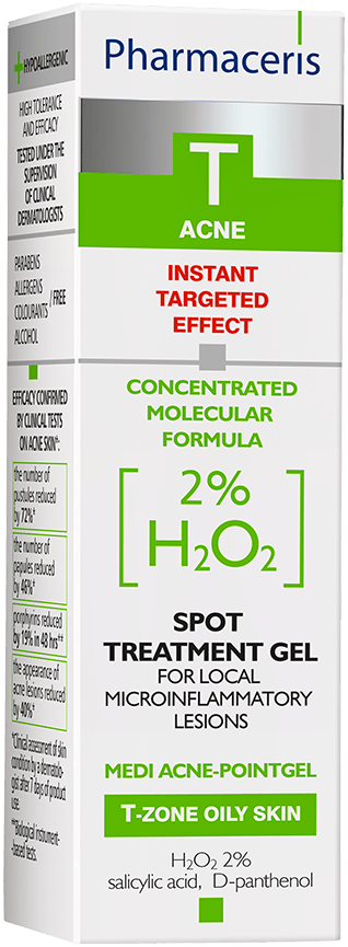 Produktet indeholder 2 % af en koncentreret formulering H2O2 og salicylsyre. Det har en molekylær målrettet indsats på akne. Produktet opløser effektivt eksisterende akne og reducerer udbruddenes størrelse og synlighed. Det forhindrer udvikling af grimme pletter, reducerer rødme samt støtter regenerering af huden.