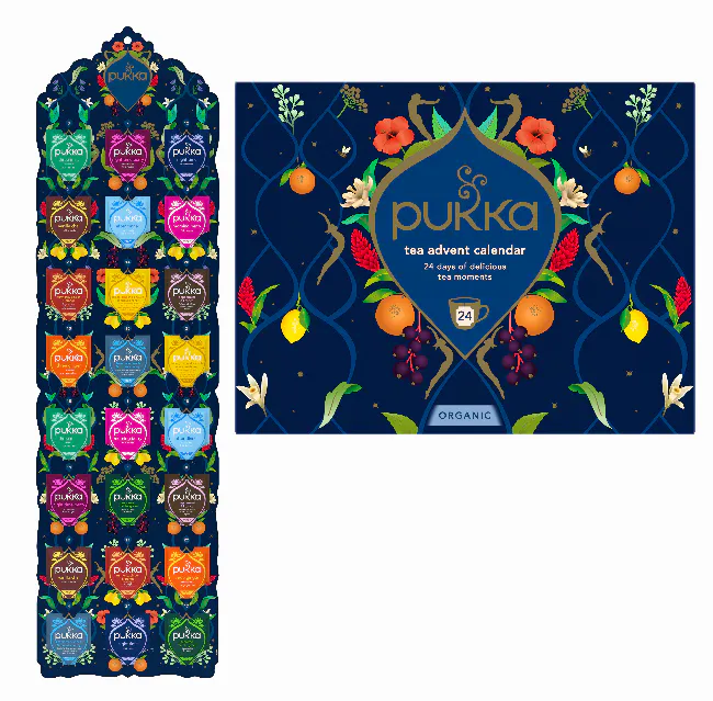 Flot og dekorativ Pukka te julekalender med 24 farverige tebreve. Nyd en økologisk, velsmagende te hver dag fra 1. – 24. december.