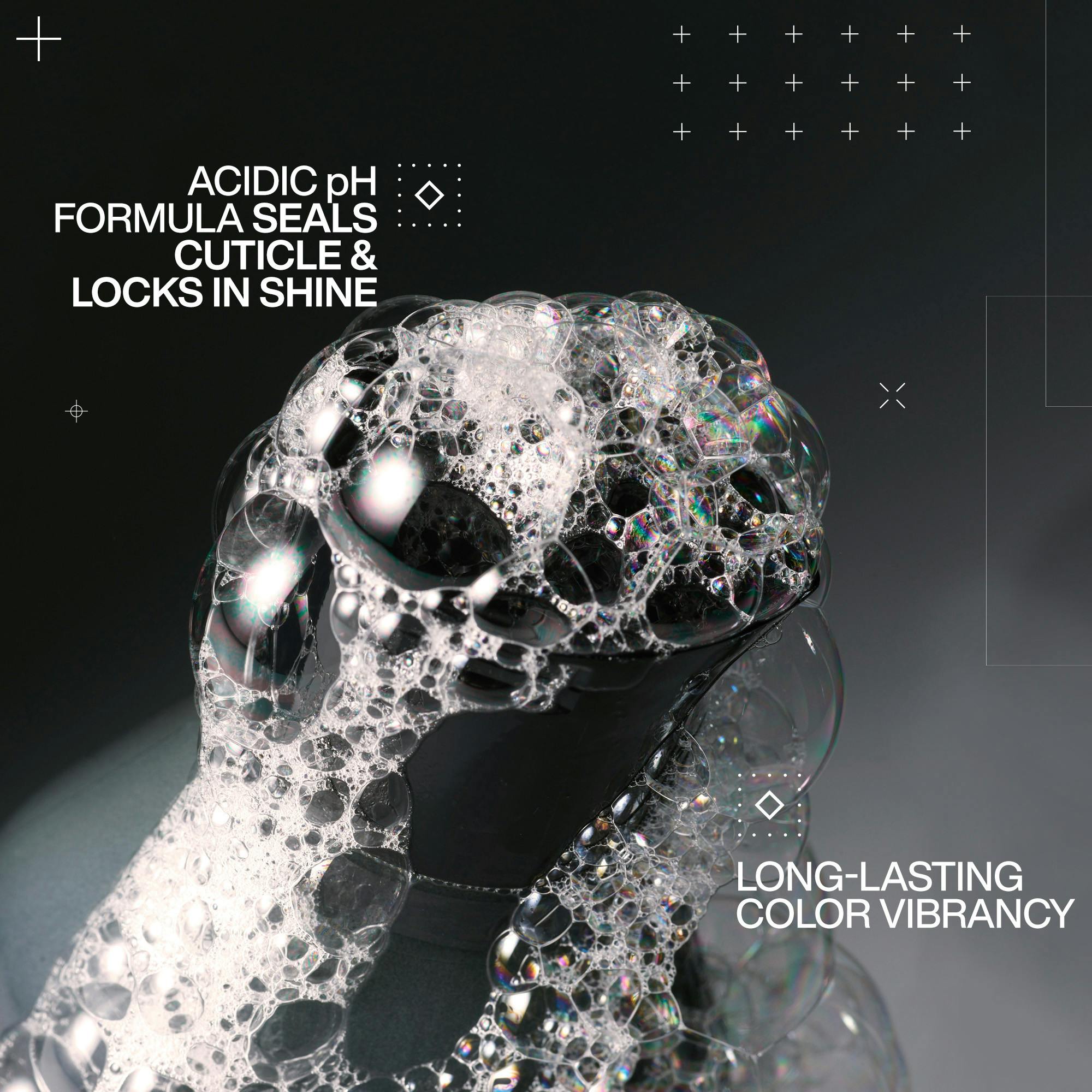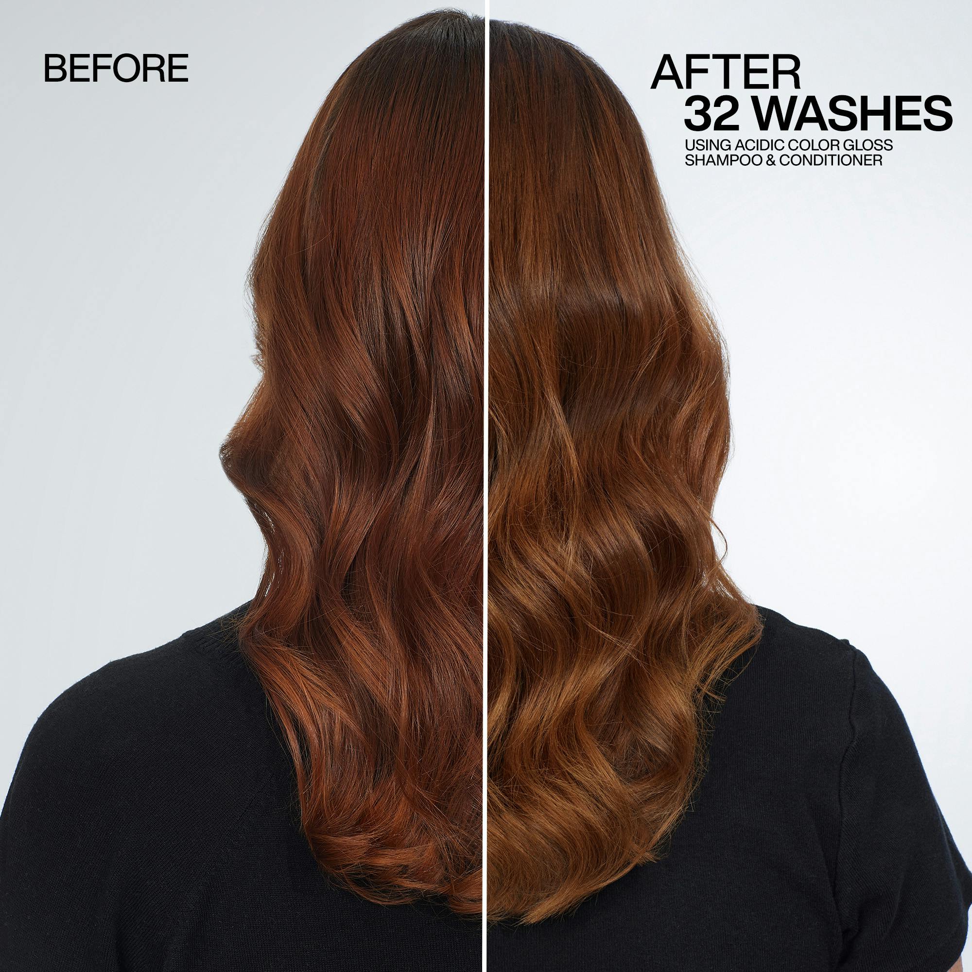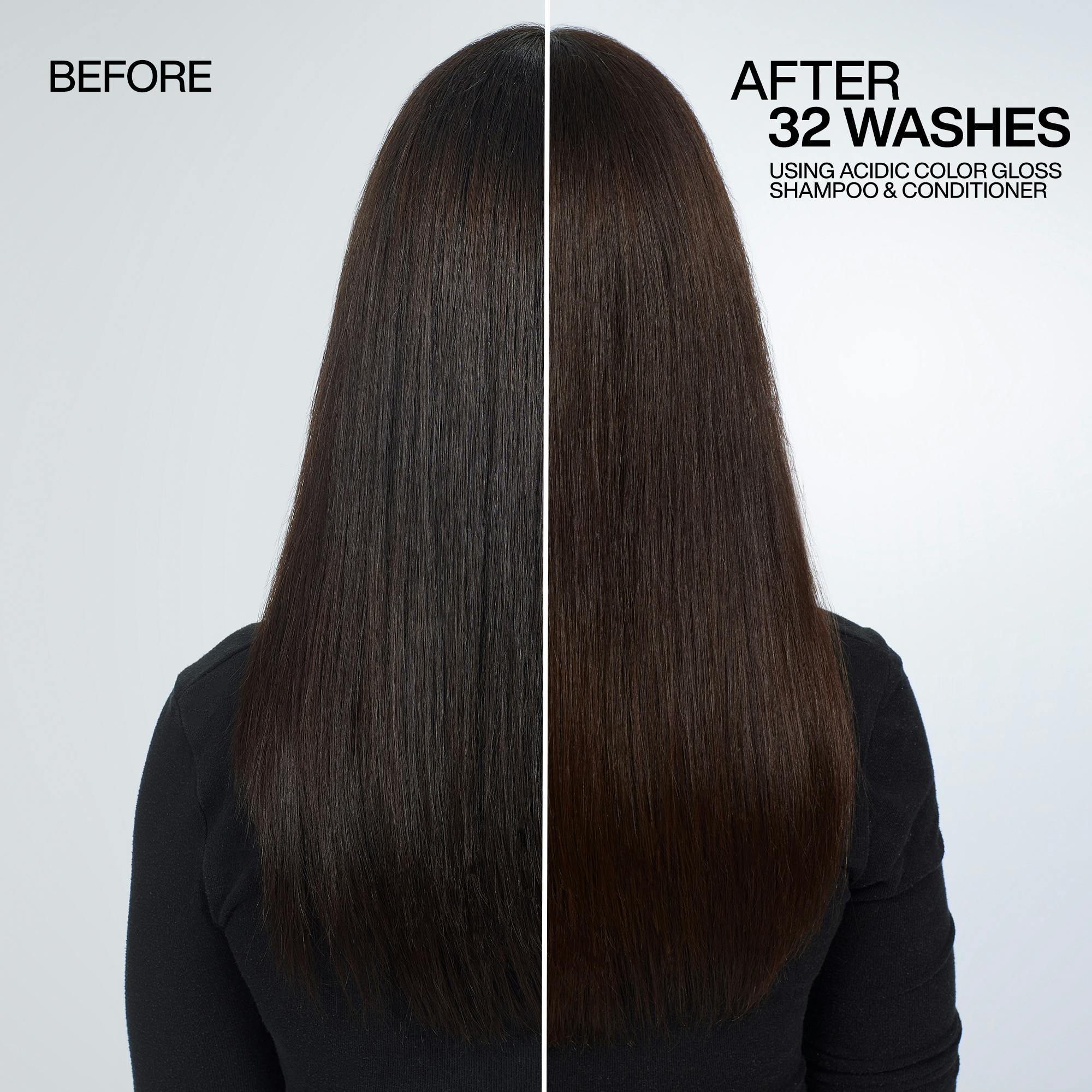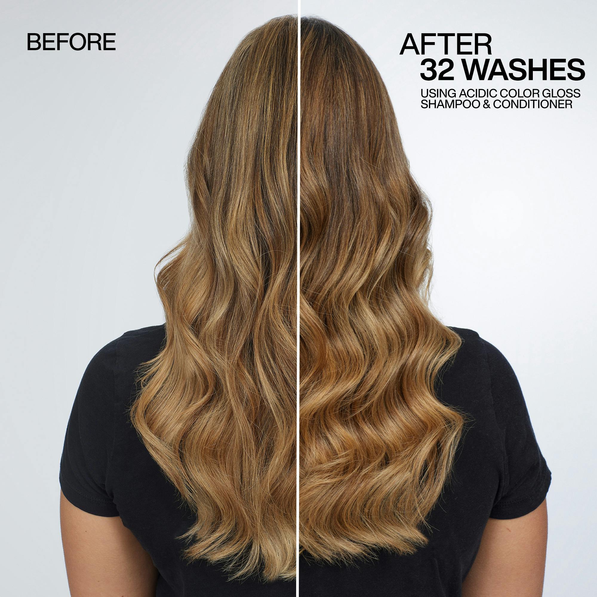 Opnå glans med Acidic Color Gloss Shampoo. Acidic Color Gloss Shampoo har en formel med en koncentreret alt-i-en-formel for glans, glathed og farvebeskyttelse. Denne luksuriøse shampoo hjælper med at forlænge farven og salon-glansen for alle hårtyper. Den er beriget med vores avancerede pH-teknologi og E-vitamin, og denne syreholdige formel hjælper med at forsegle hårets skællag og efterlader håret glansfuldt. - Håret føles øjeblikkeligt revitaliseret. Denne ph-balancerende shampoo er specifikt designet til at forlænge hårfarvens livlighed og vedligeholder glans. Resultatet? Hår der føles og ser levende, glansfuldt og sundt ud!