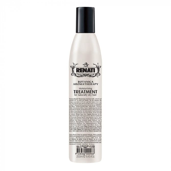 Renati Botanica Moisturising Treatment er en fantastisk og effektiv kur mod tørt hår, som trænger til en masse fugt og nogle gode ingredienser. Denne hårkur indeholder 16 naturlige og  essentielle olier samt vitaminer og proteiner, der nærer og fugter håret dybt, så det igen kan se sundt ud. Aloe Vera, argan olie, hydrolyseret silke og ris og hvedeprotein giver dit hår et løft, der får dit hår til at føles sundt og giver en masse glans. Flasken indeholder 250 ml.