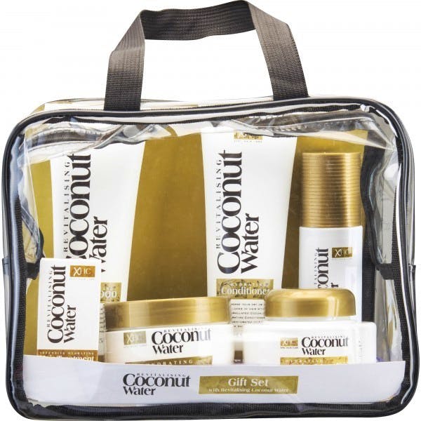 Revitalising Coconut Water giver dig her et bredt udvalg af deres lækre produkter i et flot gavesæt. Dette sæt indeholder Revitalising Coconut Water Shampoo og Conditioner på 250 ml, Revitalising Coconut Water Fugtgivende hårmaske på 220 ml, Revitalising Coconut Water Hårserum på 50 ml, Revitalising Coconut Water Heat Protection Spray på 150 ml og Revitalising Coconut Water Bodycream på 250 ml. Det hele er pakket i en fin klar taske, så det er lige til at tage med. Produkterne er utroligt fugtgivende og velduftende. Forkæl både hår og krop med de skønne produkter, som også er oplagte at give i gave.
