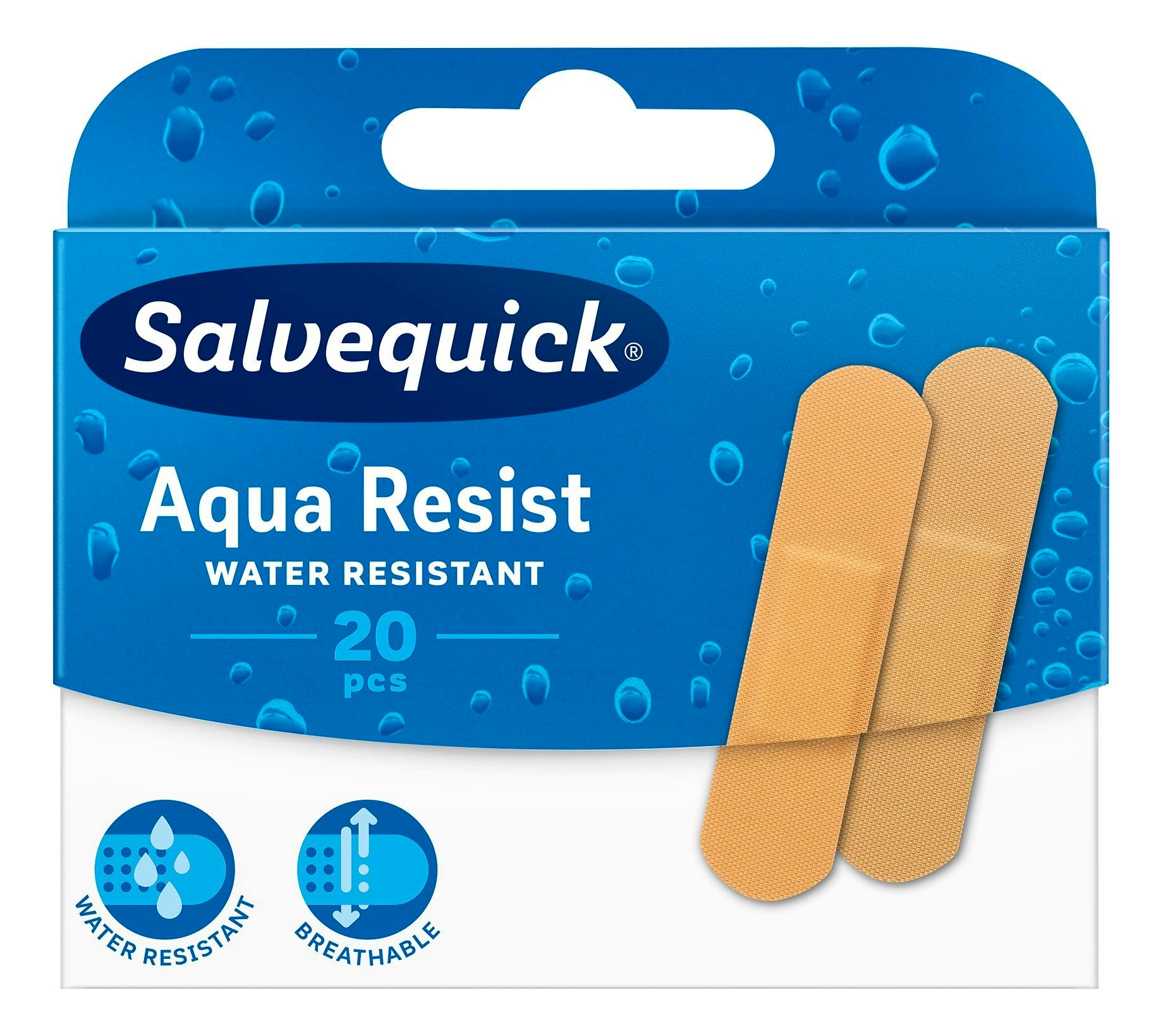 Salvequick Aqua Resist er gode plastre til hverdagens små skader. Salvequick Aqua Resist plastre er modstandsdygtige overfor vand og plejer såret, samtidigt med at det holdes rent og snavs holdes væk. Salvequicks Aqua Resist plastre er i blødt materiale og ens i størrelsen. Salvequick Aqua Resist plastre indeholder 20 styk.