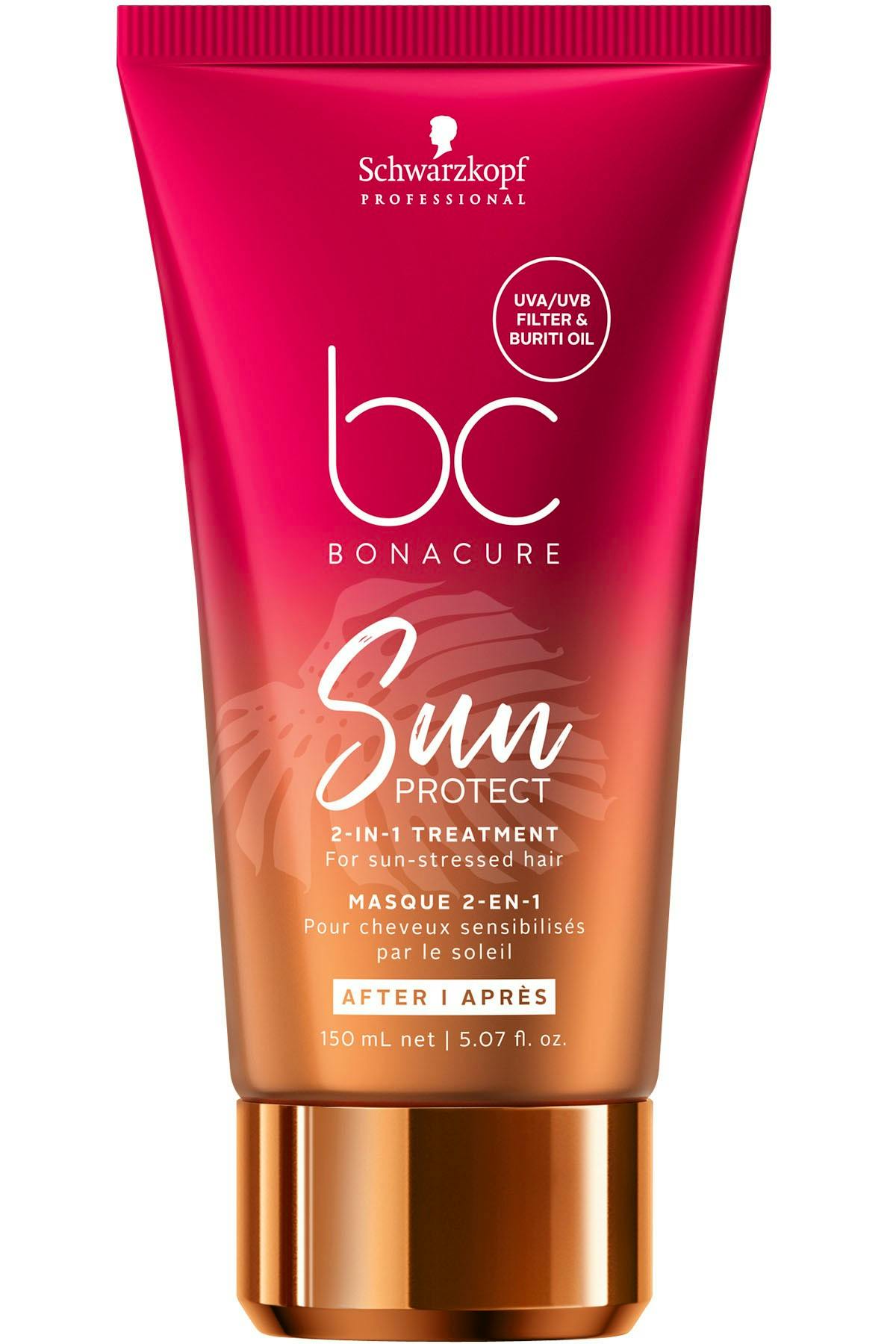 Schwartzkopf Bonacure Sun Protect 2-In-1 Treatment er en 2 i 1 hårmaske, som genfugter og reparerer tørt og solskadet hår. Hårkuren indeholder UVA og UVB filter, samt buriti-olie, som genskaber hårets fugtbalance og gør det dejligt blødt efter en dag i solen. Hårkuren er uundværlig om sommeren eller på ferien, hvor håret udsættes for sol og badning, hvilket kan blege og udtørre håret. Vask håret og kom derefter Schwartzkopf Bonacure Sun Protect 2-In-1 Treatment i håret. Lad masken virke mellem 2-10 minutter og skyl ud. Indeholder 150 ml.