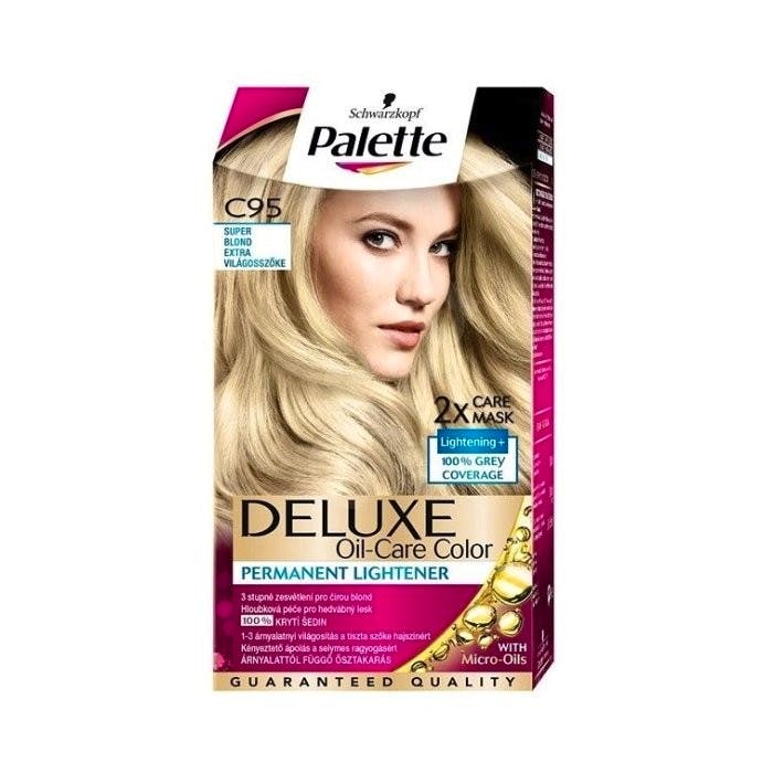 Palette Deluxe C95 Super Blond fra Schwarzkopf er en hårfarve i lys blond. Denne hårfarve har en intens og lysende effekt, der giver dit hår mere glans. Den giver samtidig håret en dybdegående plejer, hvilket fører til et silkeagtigt resultat og en smuk, blond farve uden gule toner.