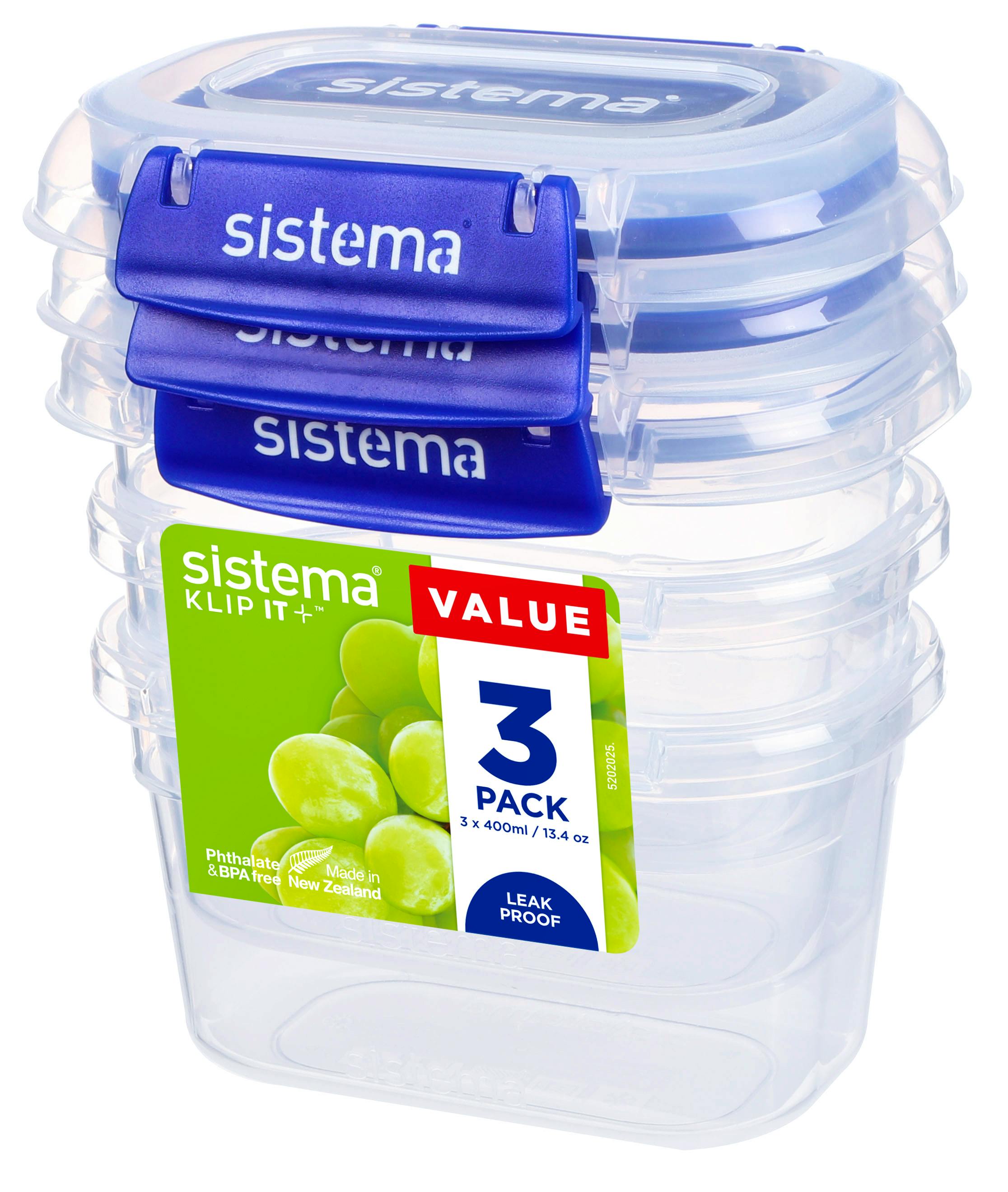 Rectangle Klip It Plus 3Pack 400ml. De smarte, rektangulære beholdere sikrer den mest effektive udnyttelse af pladsen i dit køleskab, fryser og køkkenskuffe. Sistemas® patenterede nemme låseclips og fleksible forsegling sikrer, at maden forbliver frisk i længere tid. Dette produkt kan stables, kan bruges til opbevaring af tørre ingredienser i dit skab eller skuffer, fødevarer i køleskabet eller i din fryser. Er velegnet til eks. mos, grød o.lign. Eller til agurkestænger, tomater eller vindruer til frokosten. Denne pakke indeholder 3 x 400 ml. Designet i gennemsigtigt plast, som giver dig mulighed for hurtigt at se, hvad der er i boksene. Endvidere er produktet sikkert at bruge i opvaskemaskinen (i øverste kurv) samt mikroovnen (uden låg). Phthalat & BPA fri.