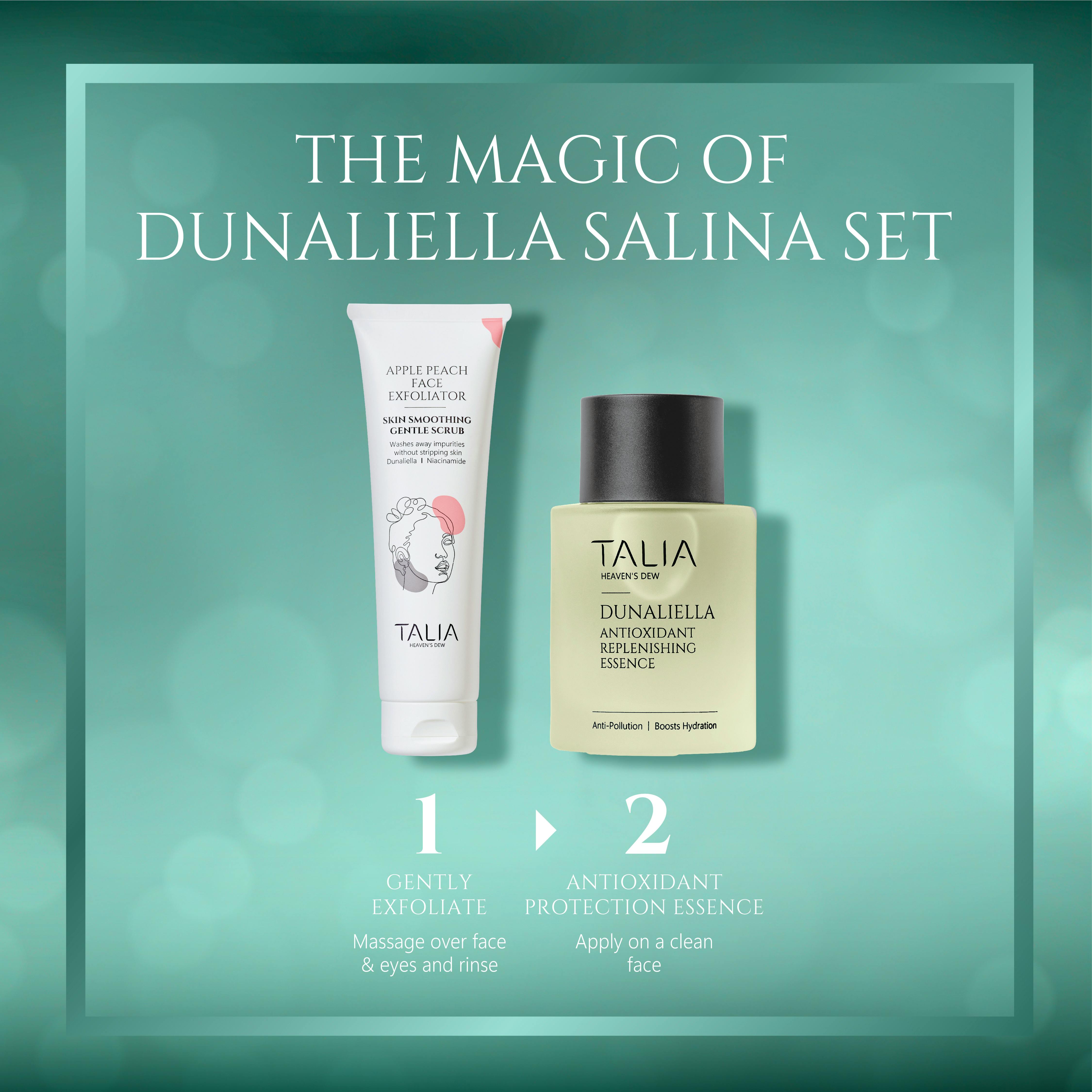 • Dunaliella Antioxidant Replenishing Essence er en kraftfuld essence, rig på antioxidanter fra Dunaliella-algen, der genopretter og beskytter huden mod miljømæssige påvirkninger. Dette sæt skaber en komplet plejerutine, der renser og styrker huden, samtidig med at den forbedrer dens udstråling og beskyttelse. Perfekt til en sund og strålende teint.