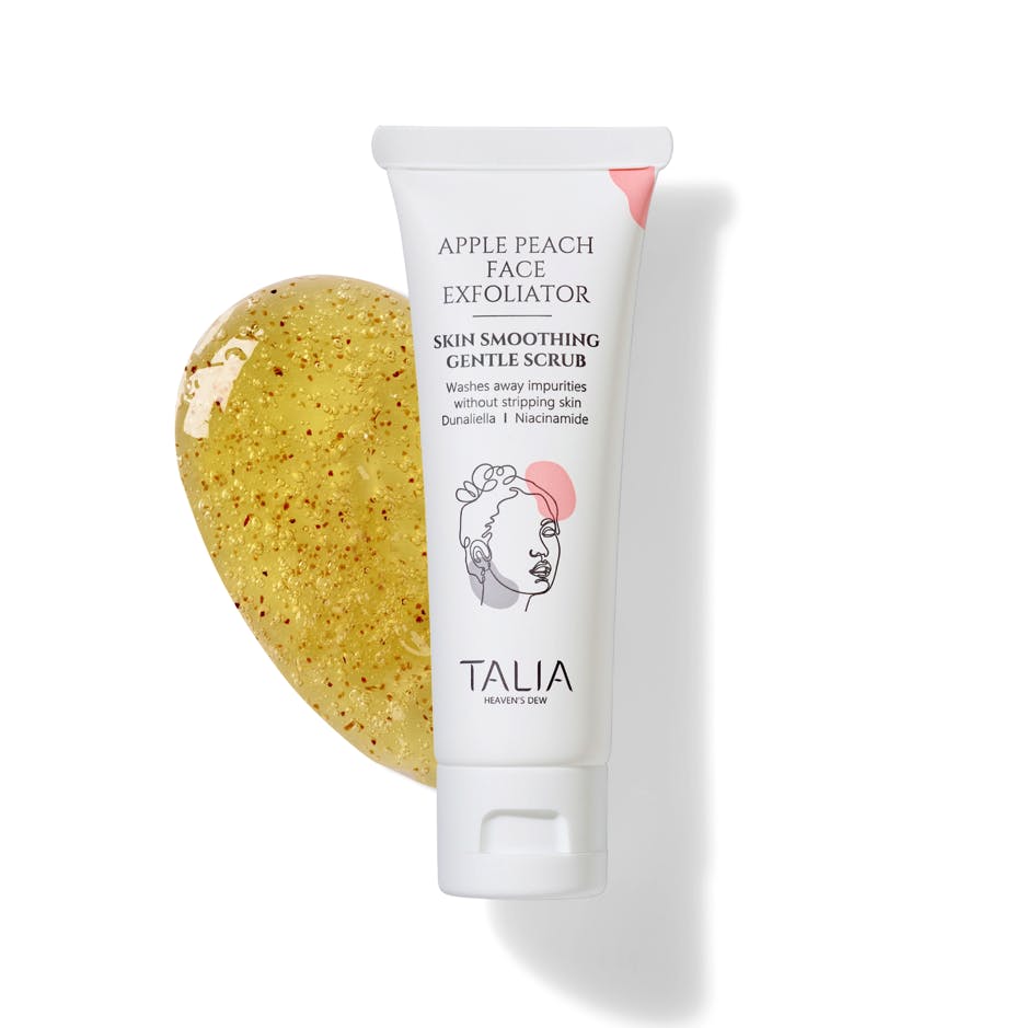 • Apple Peach Face Exfoliator, beriget med æble- og ferskenekstrakter, skånsomt fjerner døde hudceller og forfiner hudens tekstur, hvilket efterlader den glat og fornyet.
