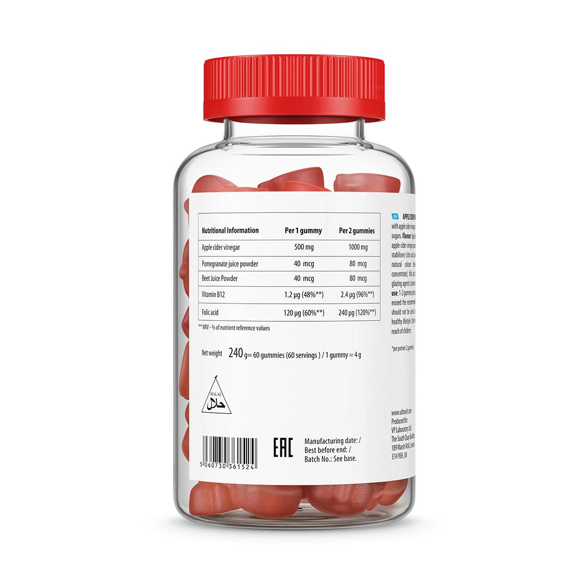 Glucose syrup, sugar, apple cider vinegar powder, glucose, gelling agent (pectin), stabilisers (citric acid, sodium citrate), natural apple flavour, natural colours (beta-carotene, purple carrot juice concentrate), folic acid, vitamin B12 (as Cyanocobalamin), glazing agents (coconut oil, carnauba wax)