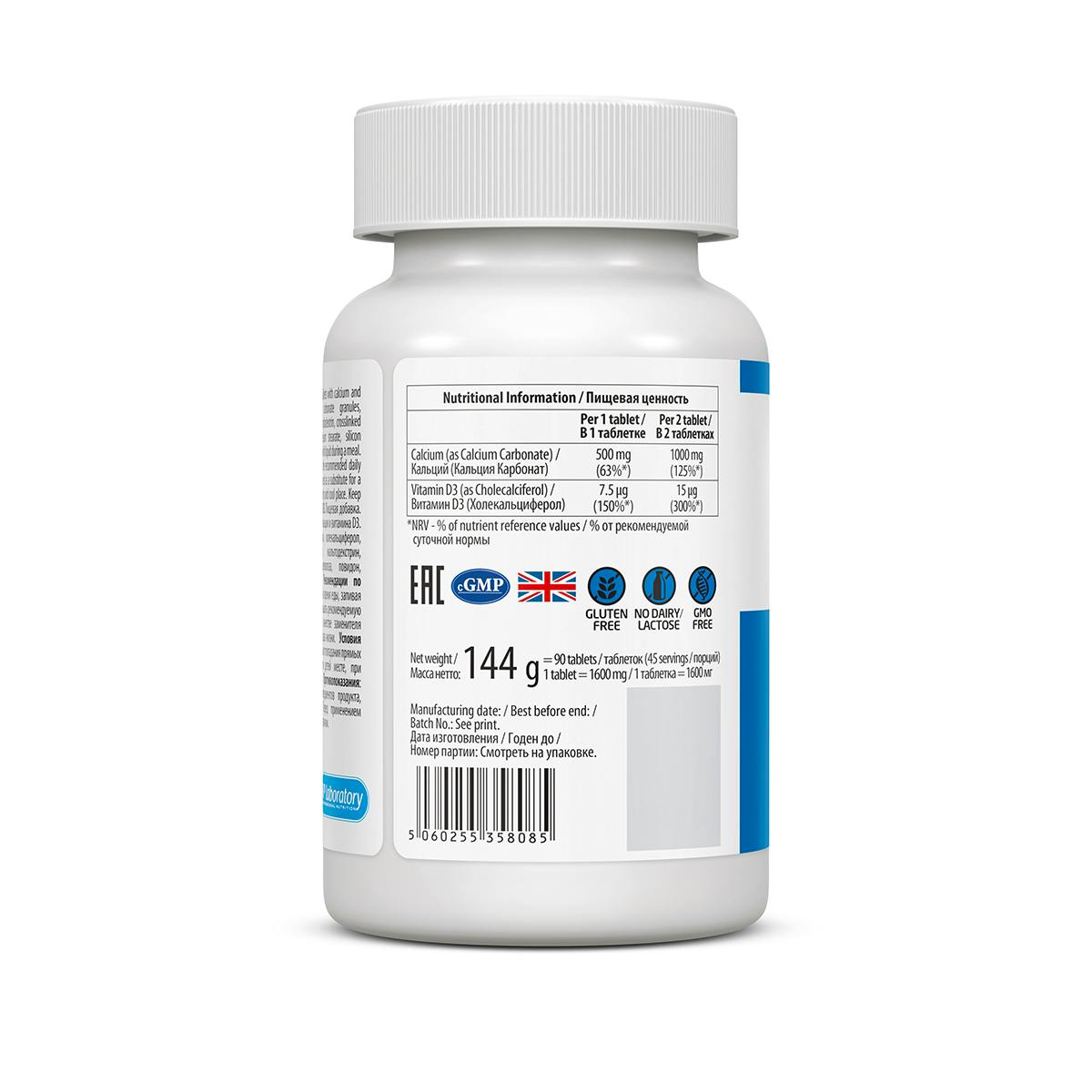 Calcium carbonate granules, bulking agent (microcrystalline cellulose), thickener (maltodextrin), stabilizers (сross-linked sodium carboxymethyl cellulose, povidone), anti-caking agents (magnesium stearate, silicon dioxide), cholecalciferol (vitamin D).