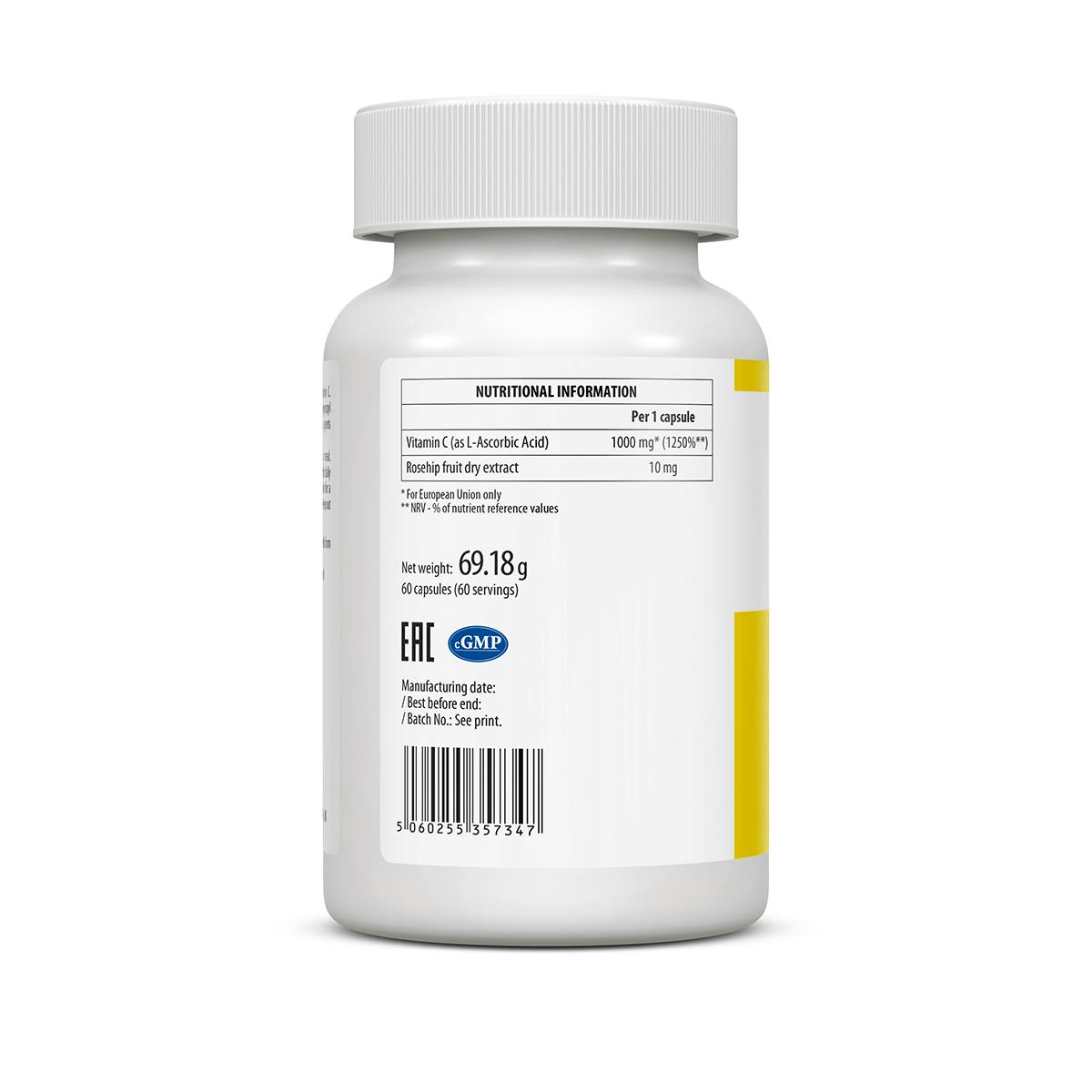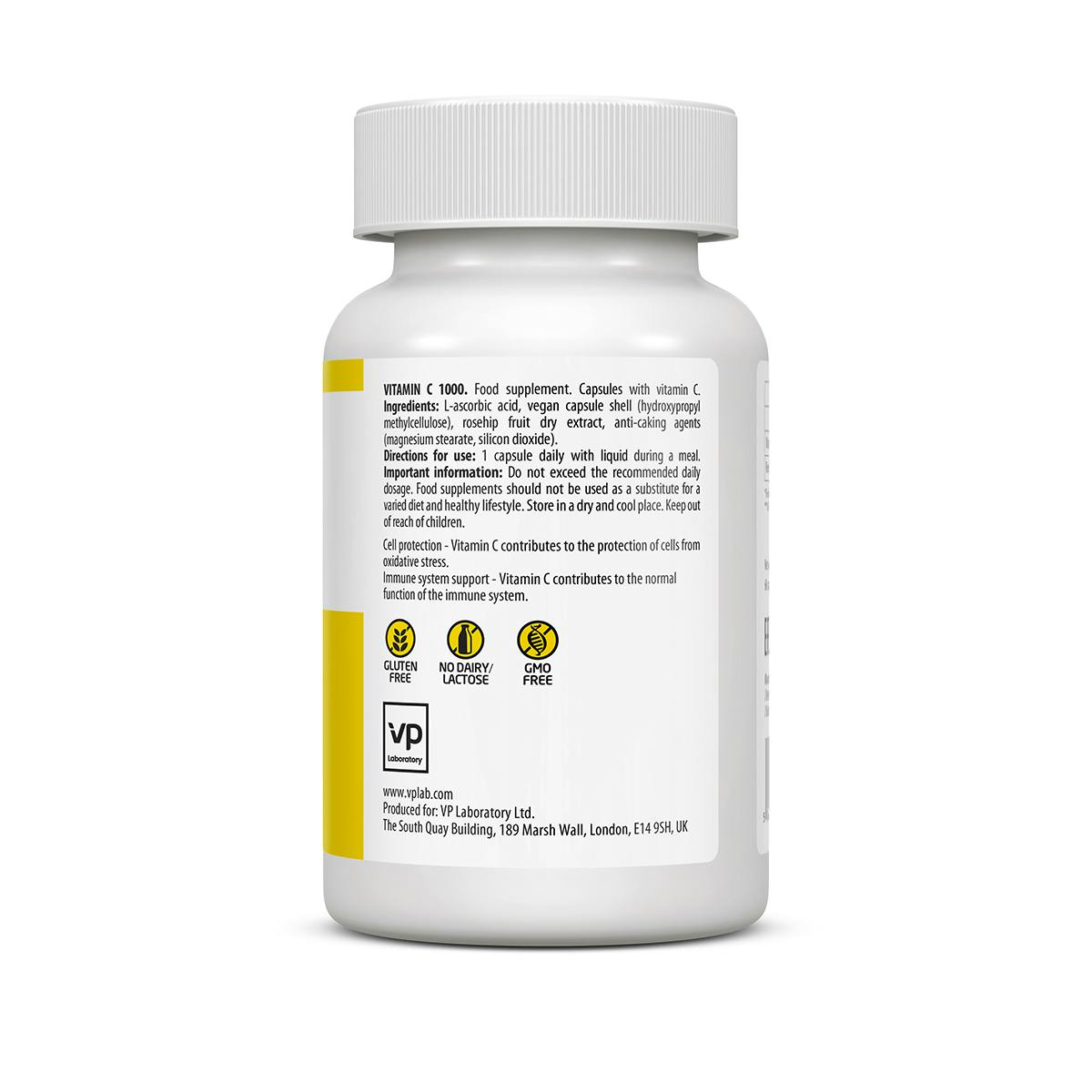 : L-ascorbic acid, vegan capsule shell (hydroxypropyl methylcellulose), rosehip fruit dry еxtract, anti-caking agents (magnesium stearate, silicon dioxide).