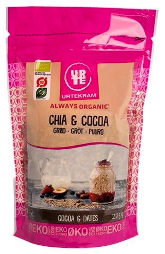 Urtekram Chia & Cocoa Grød Øko er en "rå" grød, der indeholder dadler, chia- og hampefrø samt glutenfri havre.