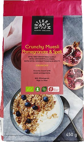 Crunchy Muesli Granatæble & Spelt er en lækker og sund morgenmadsoplevelse fra Urtekram.