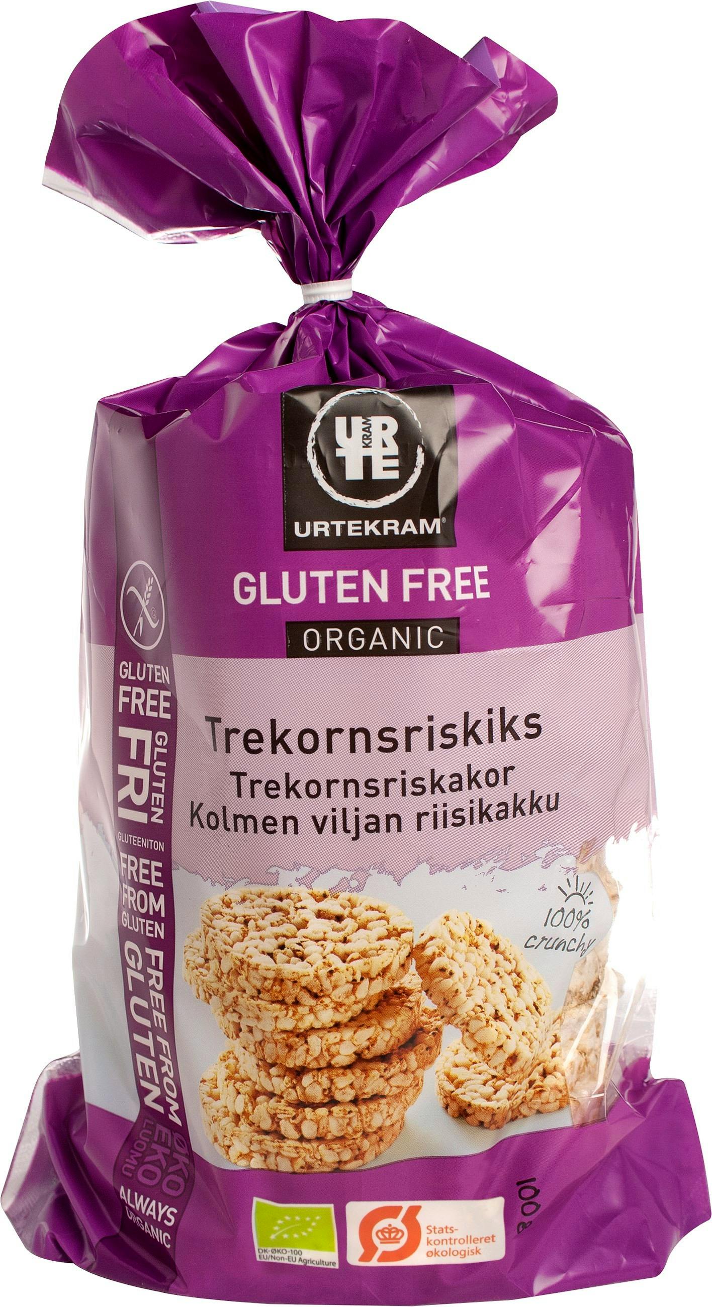 Nyd Urtekram Trekornsriskiks Glutenfri Øko som en snack på farten eller som en eftermiddags godbid til at stille den lille sult.