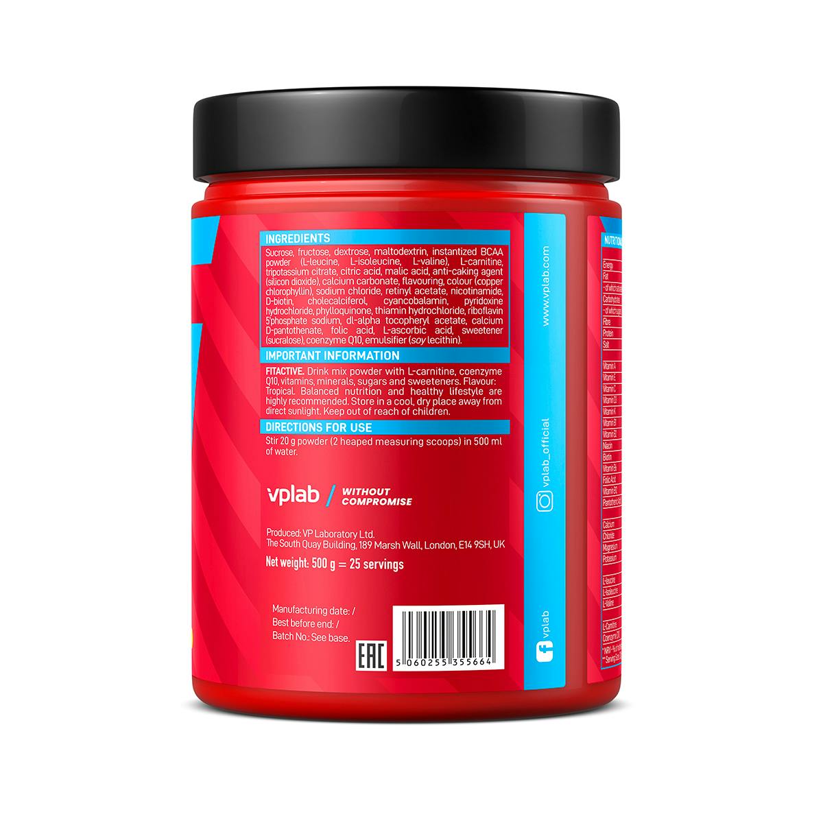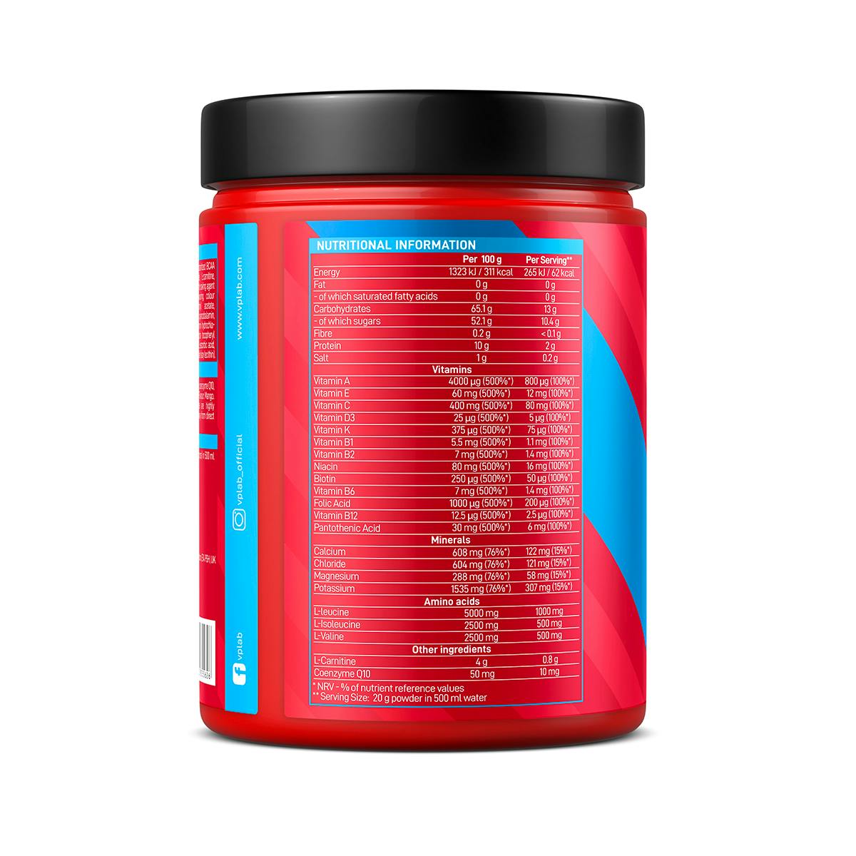 Sucrose, fructose, dextrose, maltodextrin, instantized BCAA powder (L-leucine, L-isoleucine, L-valine), L-carnitine, tripotassium citrate, citric acid, malic acid, anti-caking agent (silicon dioxide), calcium carbonate, flavouring, colour (сopperсhlorophyllin), sodium chloride, retinyl acetate, nicotinamide, D-biotin, cholecalciferol, cyancobalamin, pyridoxine hydrochloride, phylloquinone, thiamin hydrochloride, riboflavin 5’ phosphate sodium, dl-alpha tocopheryl acetate, calcium D-pantothenate, folic acid, L-ascorbic acid, sweetener (sucralose), coenzyme Q10, emulsifier (soy lecithin)