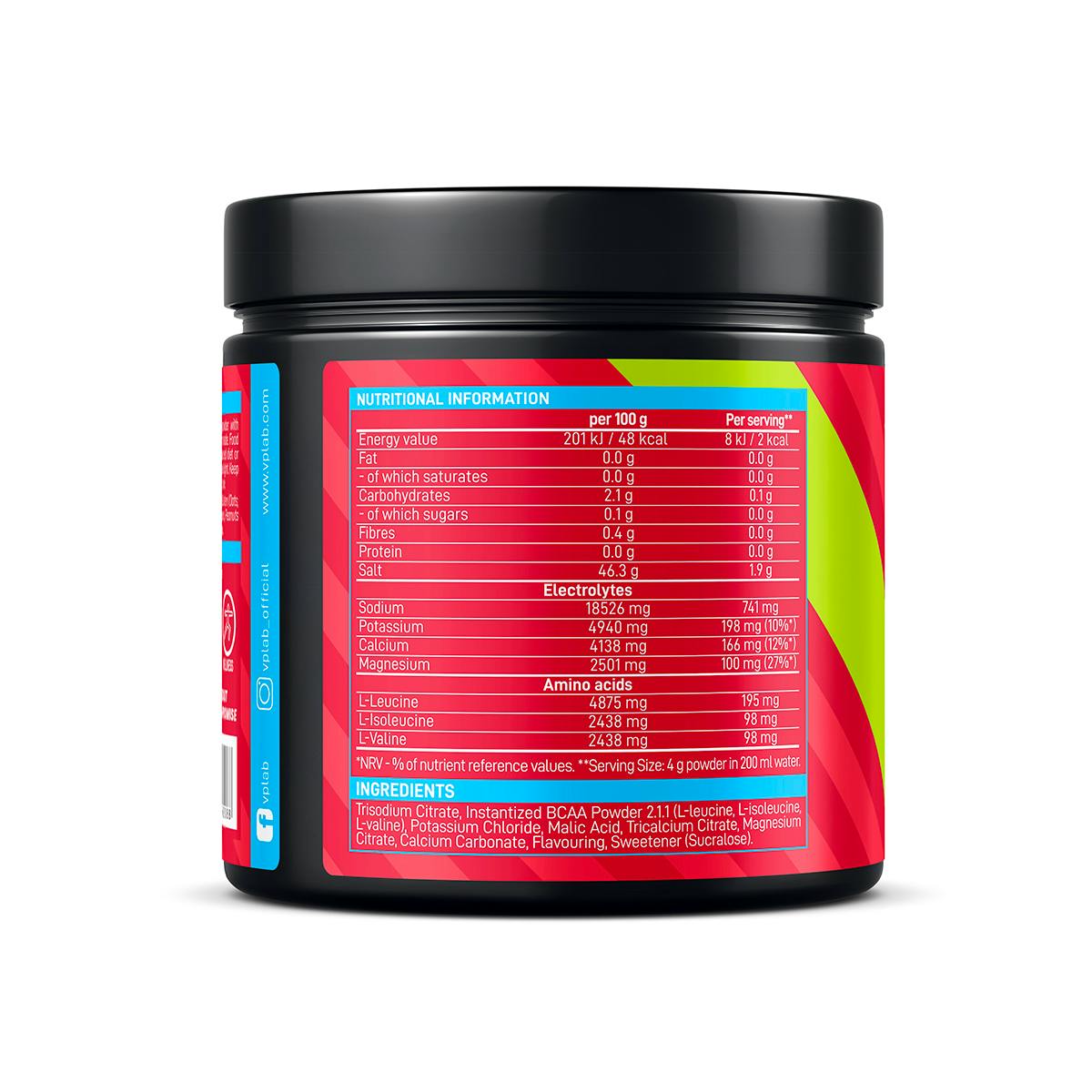 Trisodium Citrate, Instantized BCAA Powder 2:1:1 (L-Leucine, L-Isoleucine, L-Valine),Potassium Chloride, Malic Acid, Tricalcium Citrate, Magnesium Citrate, Calcium Carbonate, Flavouring, Sweetener (Sucralose)