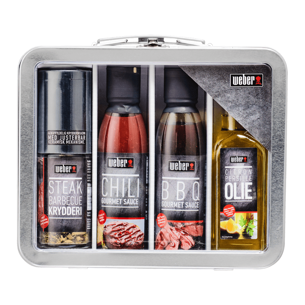 Weber Gourmet Grillkuffert indeholder fire smagfulde produkter til det perfekte grillarrangement. Kufferten indeholder 1 x steak barbercue krydderi, 1 x chili gourmet sauce, 1 x BBQ gourmet sauce og 1 x citron-persille olie. Altså fire velsmagende produkter til optimal tilberedning af grillmad. De smagfulde blandinger er tiltænkt til krydring af kød, grøntsager m.m. Produkterne kommer i en praktisk kuffert, som du nemt kan transportere med dig.