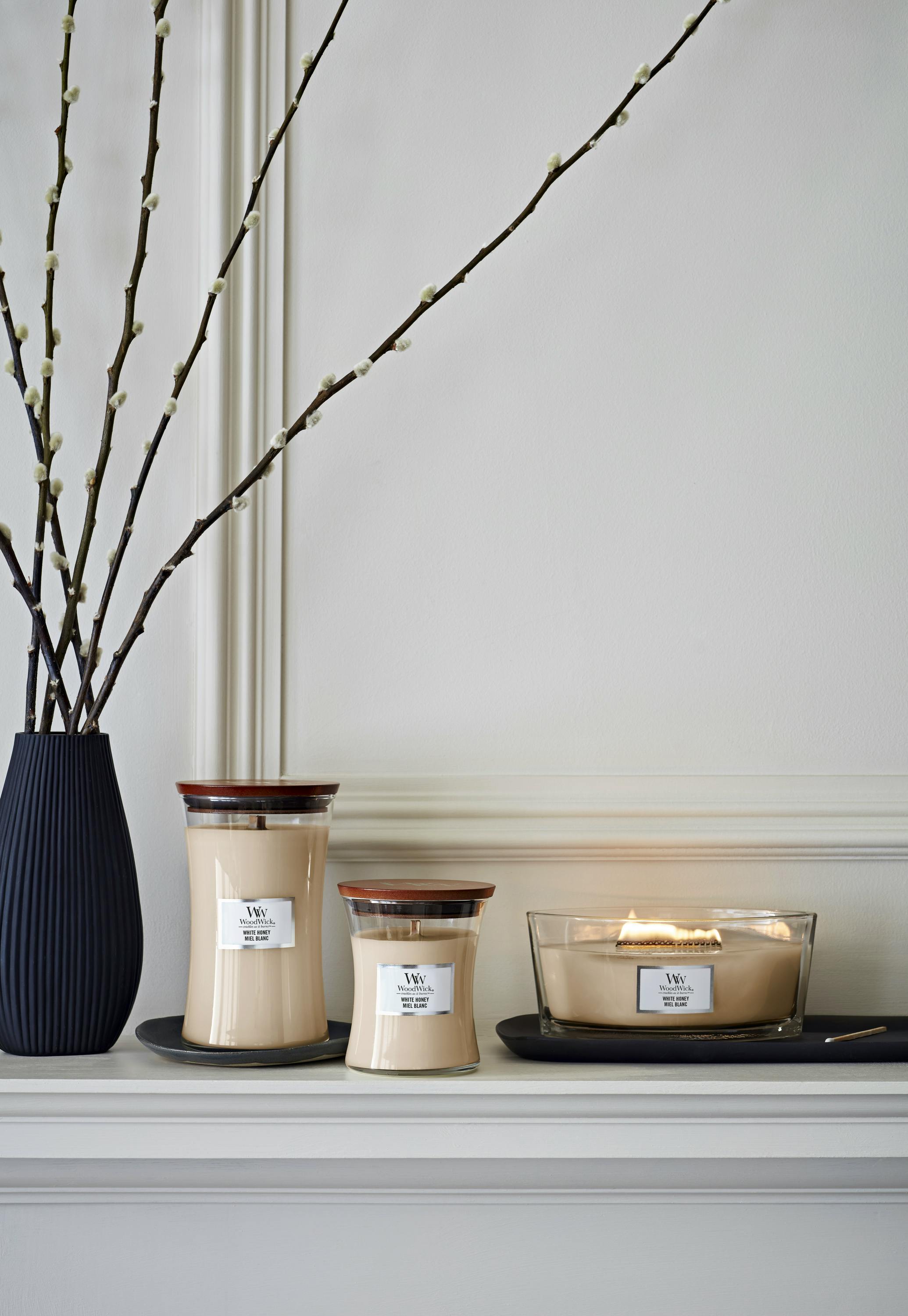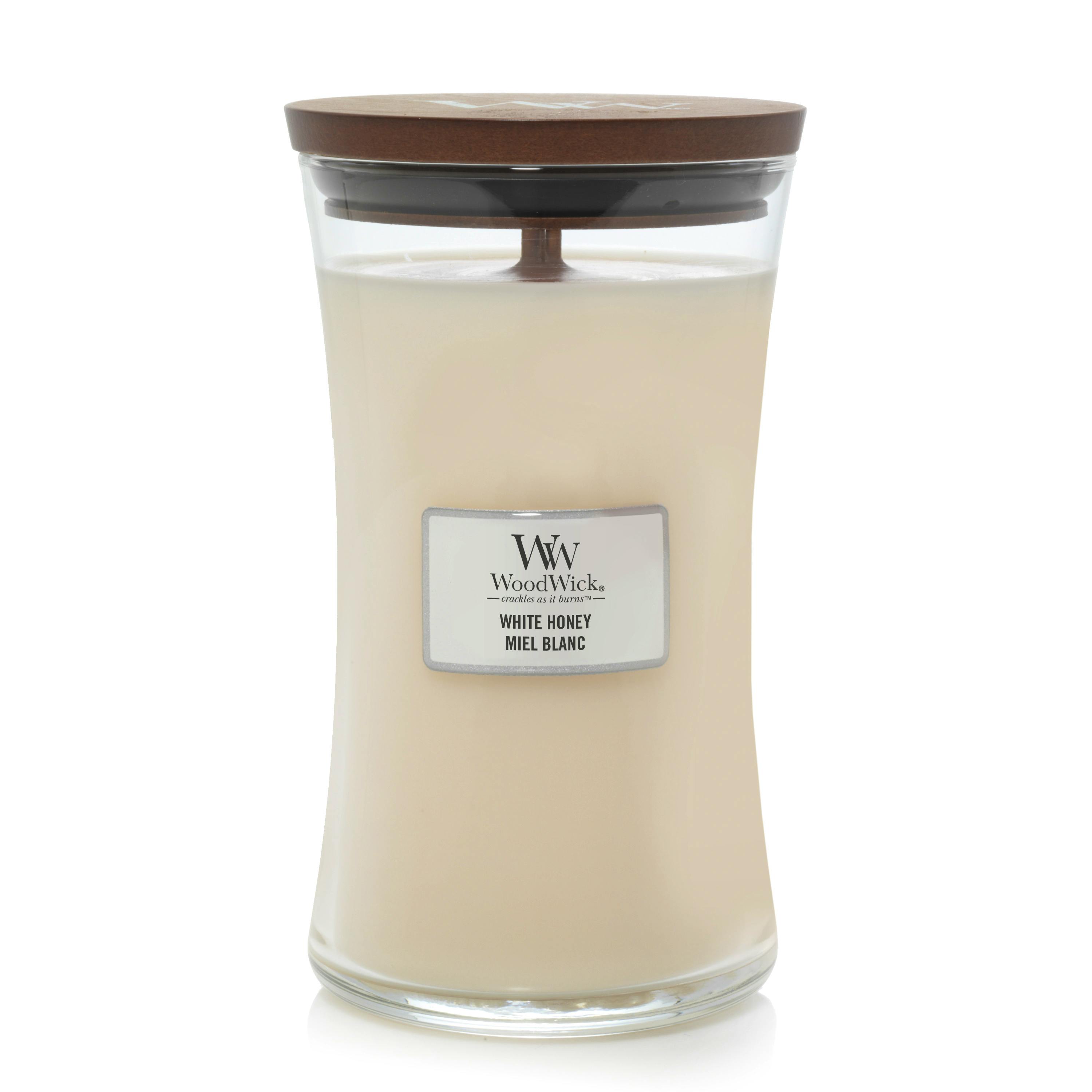 WoodWick White Honey Large Hourglass er en fortryllende og delikat duftoplevelse, der bringer en følelse af elegance og sødme ind i dit hjem.