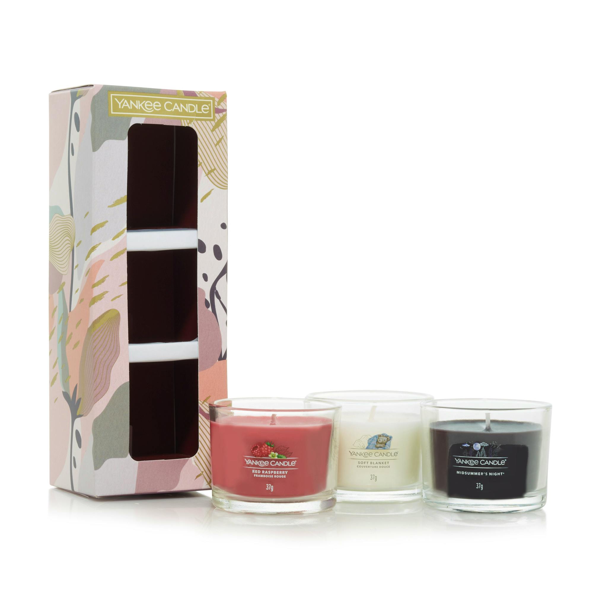 Hver af de tre duftlys i Filled Votive Gift Set har sin egen unikke duft, der kan bruges til at skabe forskellige stemninger. Uanset om du ønsker at skabe en beroligende atmosfære til en afslappende aften derhjemme, eller ønsker at tilføje en frisk og livlig duft til dit hjem, er denne gaveæske det perfekte valg. Med Yankee Candle's duftlys kan du nemt tilpasse duften i dit hjem til enhver lejlighed.